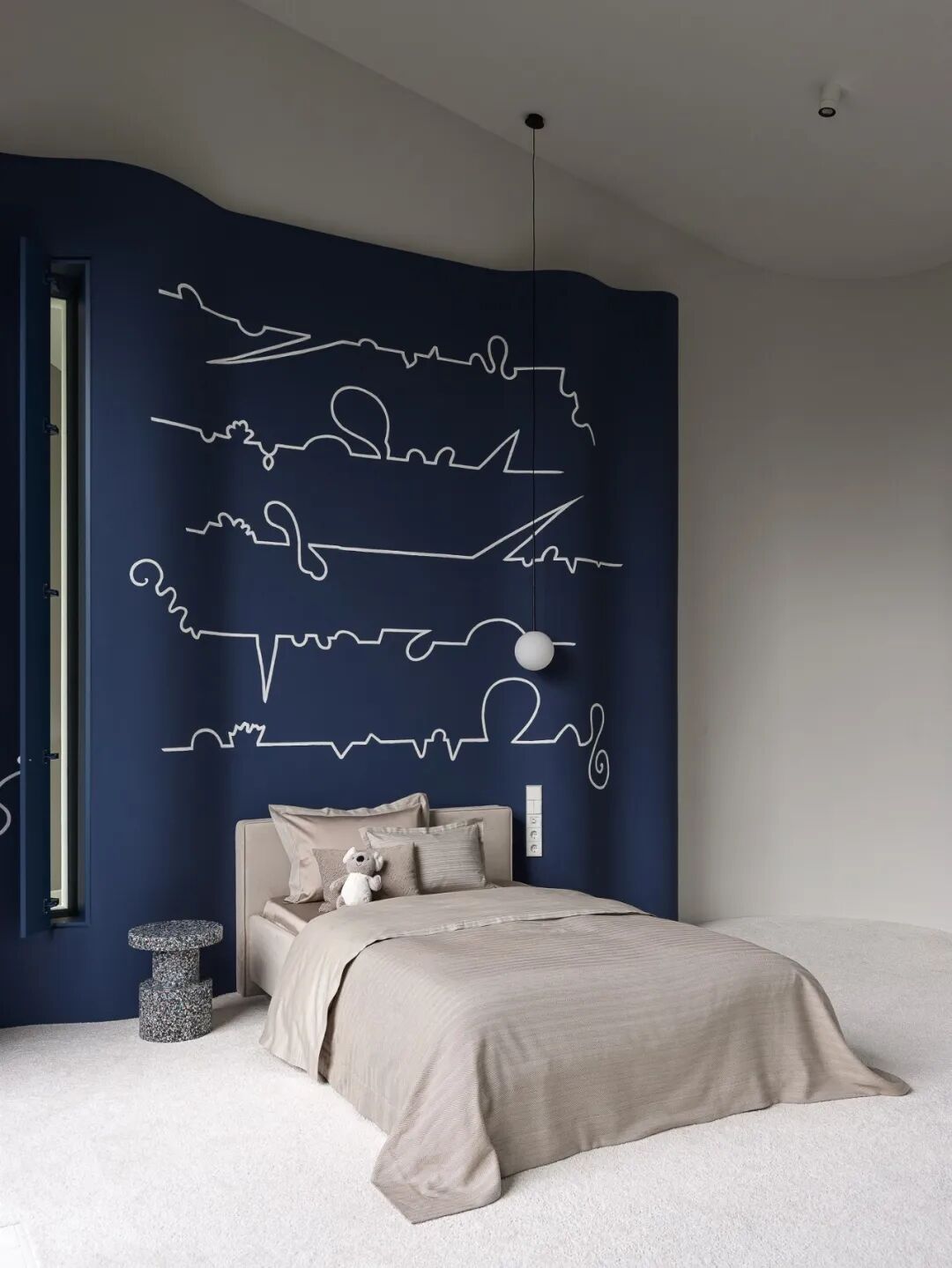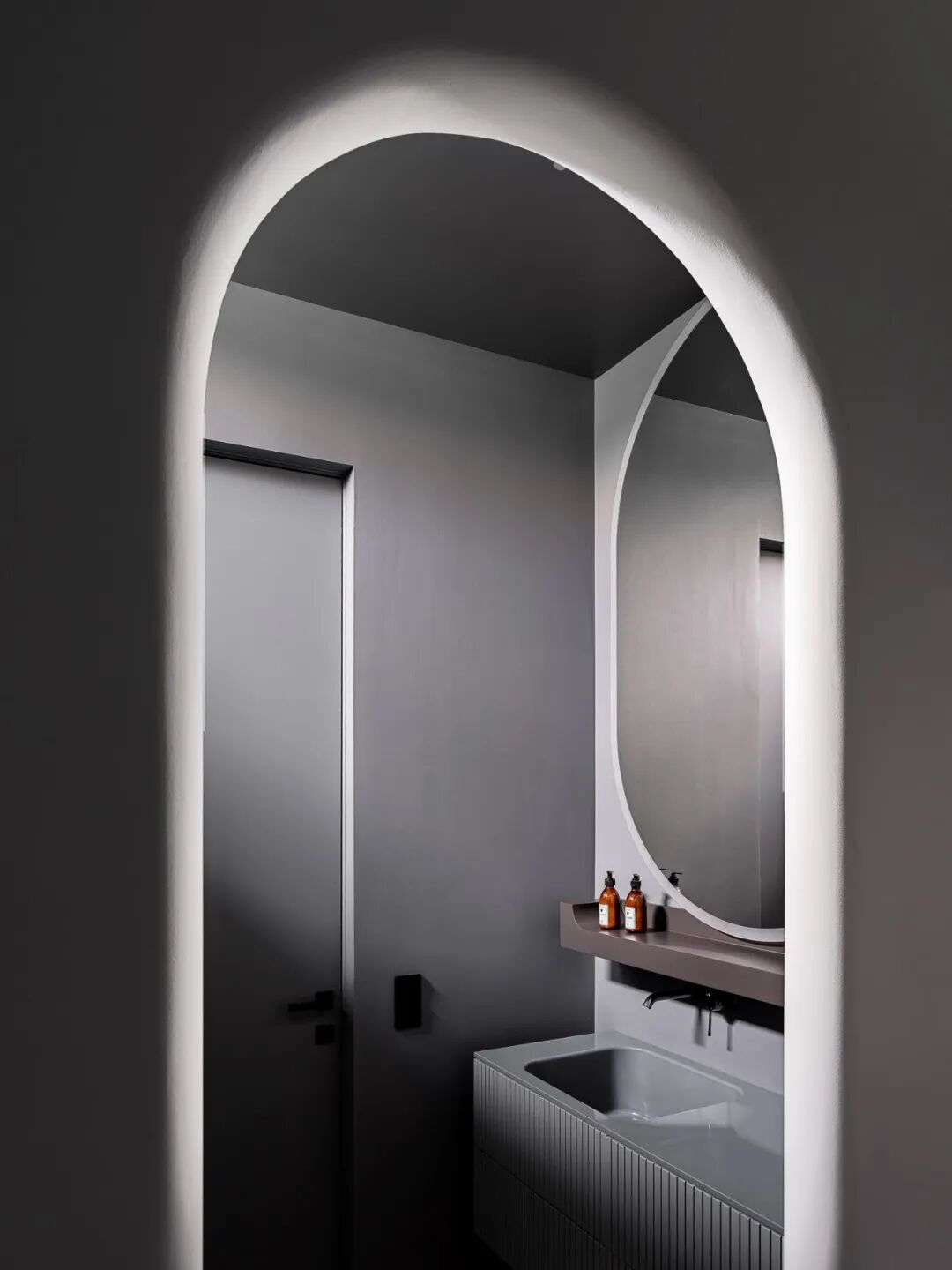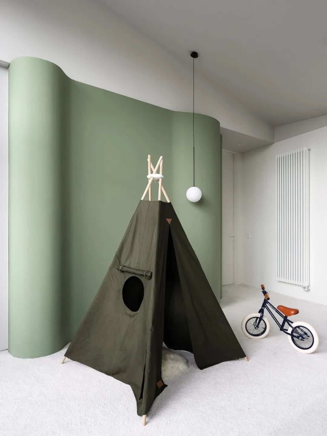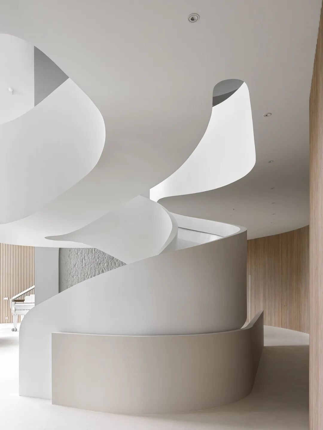 房子中央巨大的双光空隙激发了我们创造一个流动、优雅的楼梯的灵感。房子形状的棱角和锐利与内部形状和颜色的柔和形成鲜明对比。中央的壁炉向两侧开放,同时为楼梯走廊和带蓬松沙发的客厅供暖。