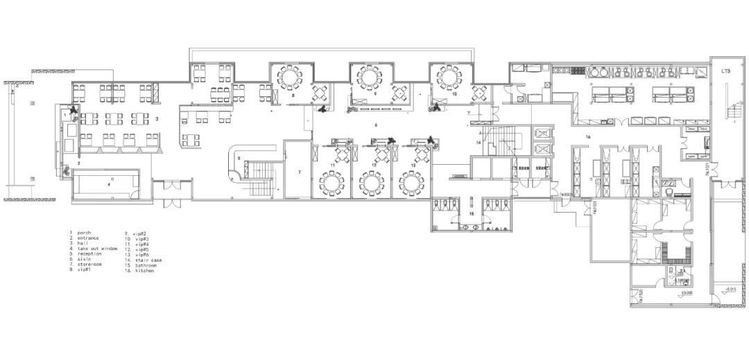 门廊的屋顶在室内延伸出悬挑的屋檐,从而可以遮蔽掉过强的天光,立面层次也因光线变化而丰富。门廊步道与大厅廊道串联,南侧为外卖区,北侧为大厅就餐区。