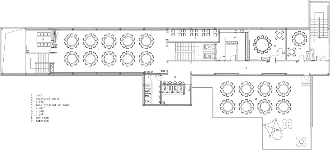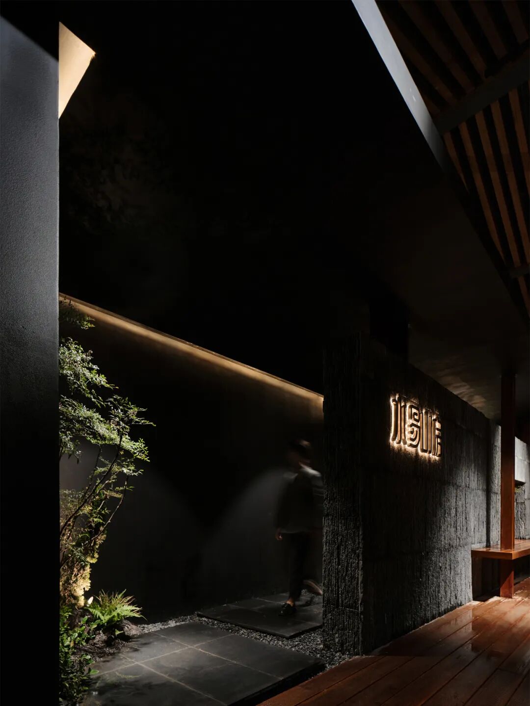 包间区域以抬高的地面形成整体性。公共区域沿墙体布置景观,同时以连续的折线来定义包间的边界。苔藓和石组点缀其间,如同一处洄游式庭院邀你入内。