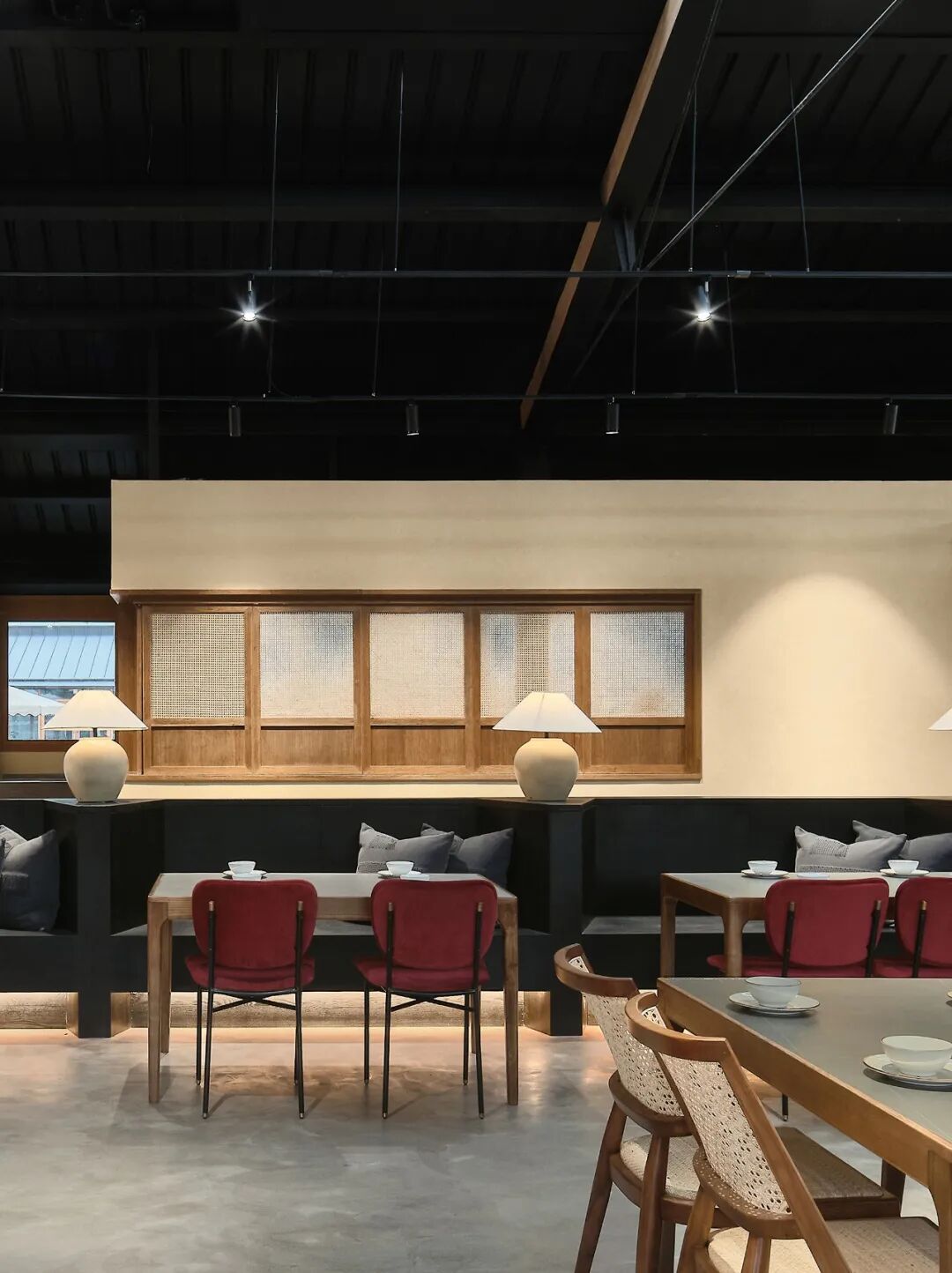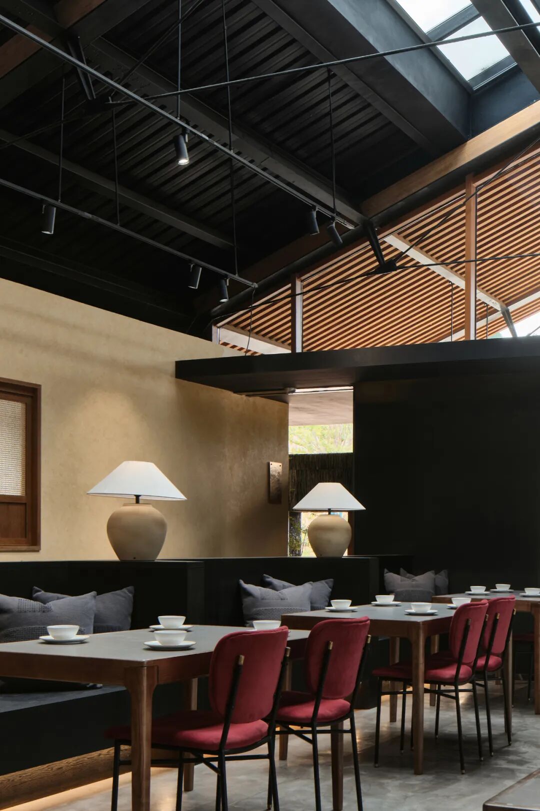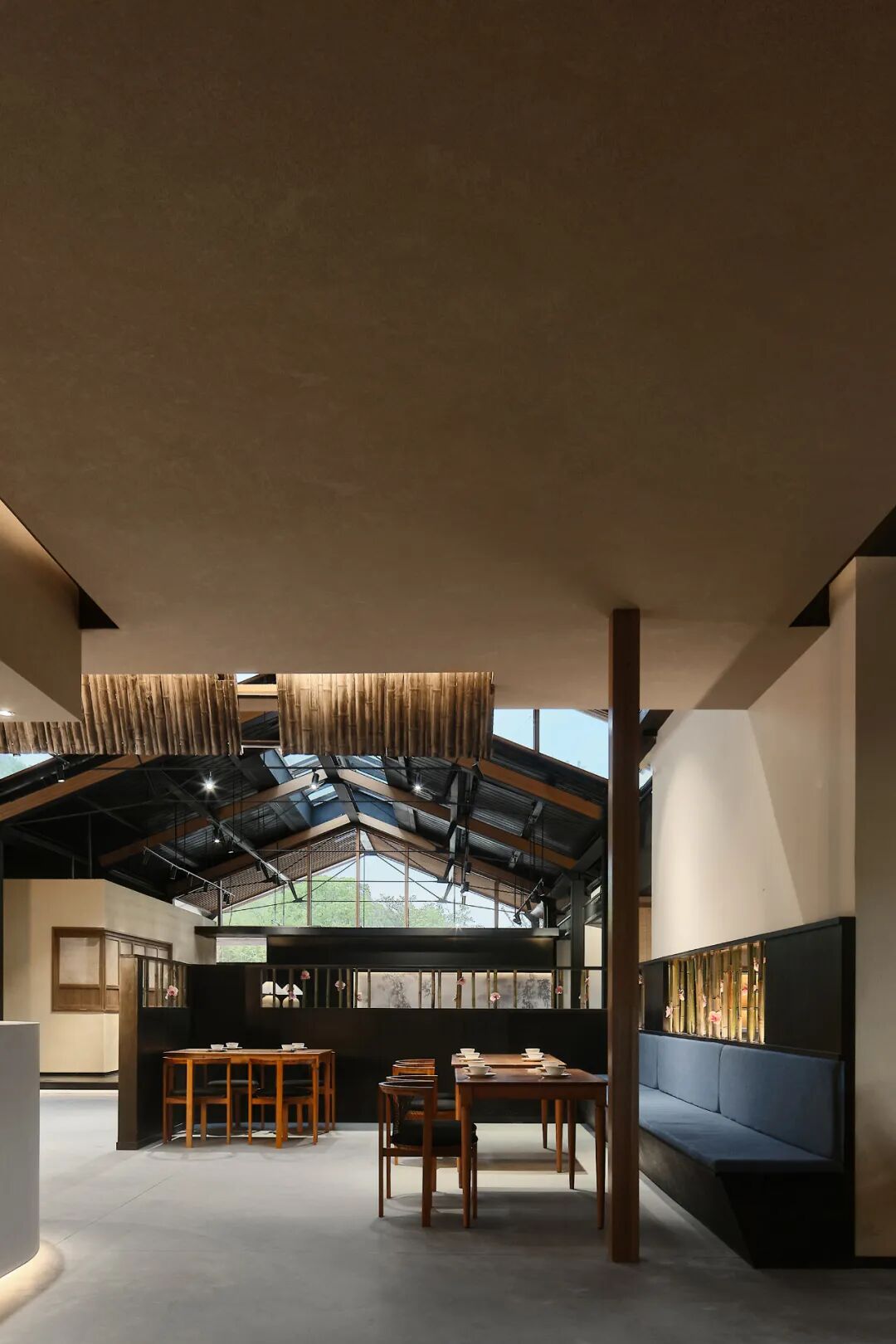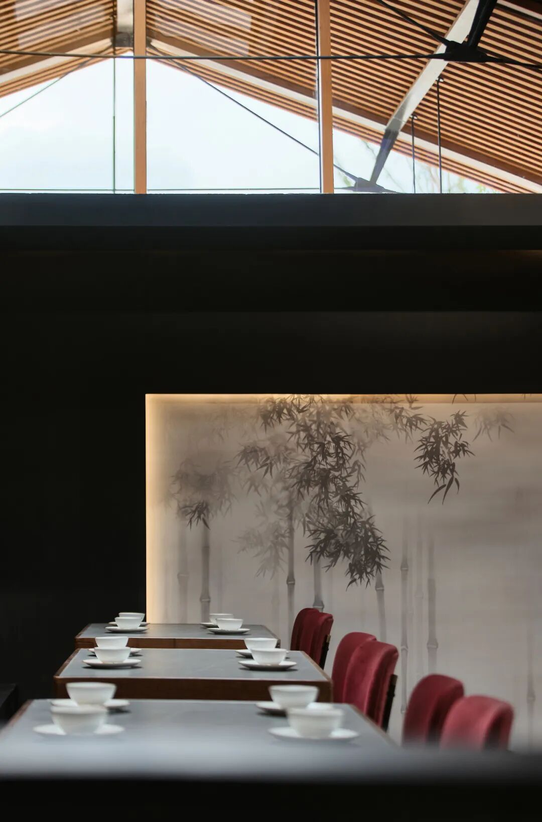 一层空间除去厨房区域,它以中部前台为界划分了东西两侧的不同服务功能。西侧为敞开式大厅服务,东侧为静谧的包间区域。如此营造明与暗、动与静的形式转换。中心区域的巨大山墙以倾斜的竹模板挑出半截屋顶,阳光从垂直向度的建筑坡顶撒落至此,赋予房中之房的古老形态。