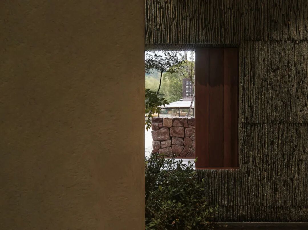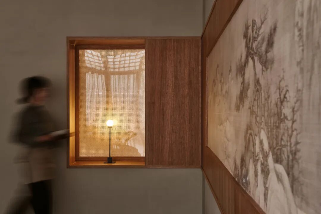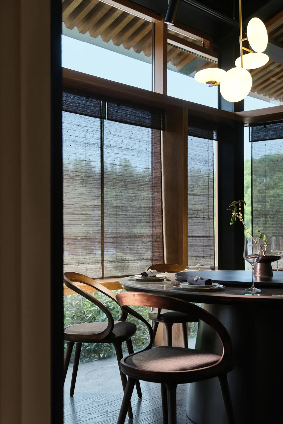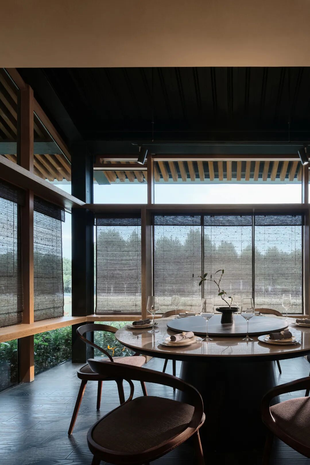 面朝湖面的包间,我们将窗景在垂直方向切分为三段。用木质框出中段窗景并以半透麻草帘垂挂。虚透的窗景悬浮于室内,同时也形成室内对人的包裹。