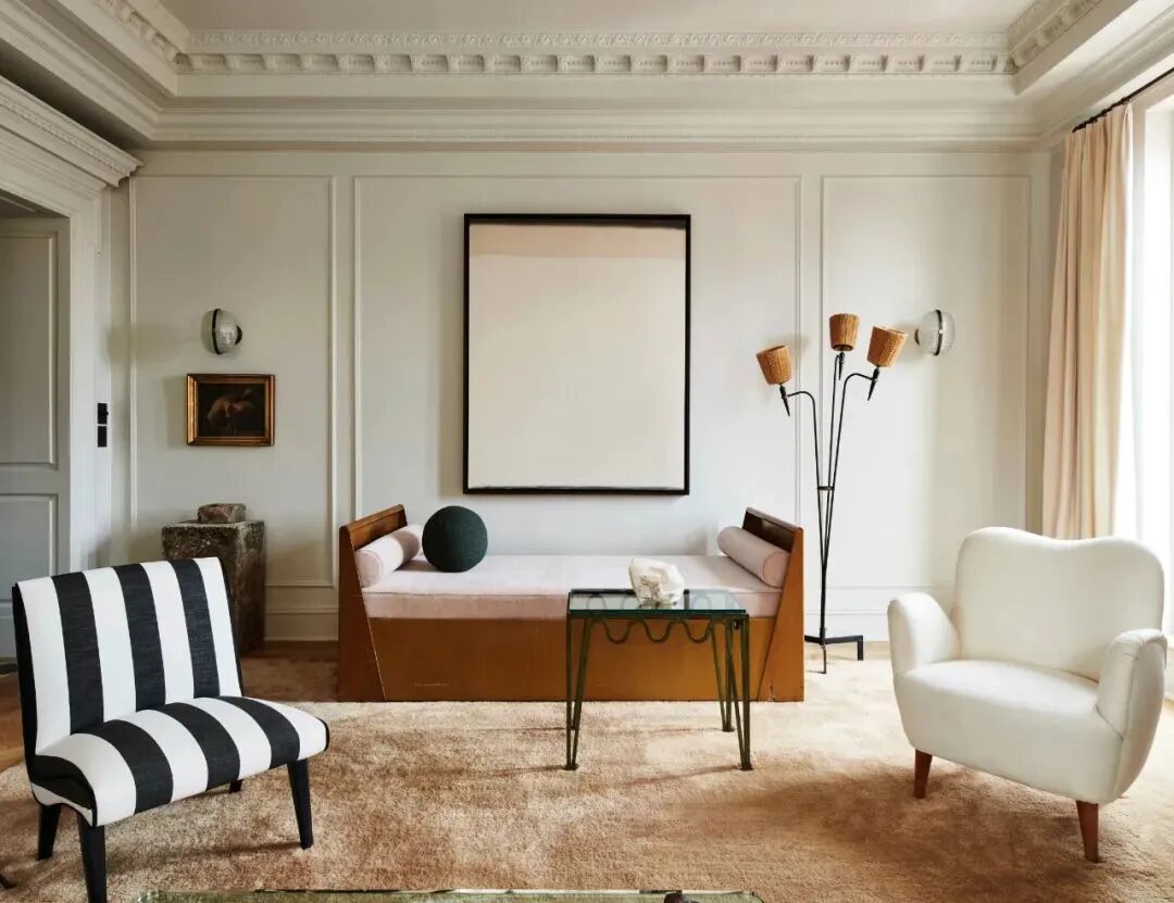 Regarding natural light and classic architecture in the 1920s, designers work in their preferred neutral color panels, bronze and gypsum paint, antique mirrors and marble.