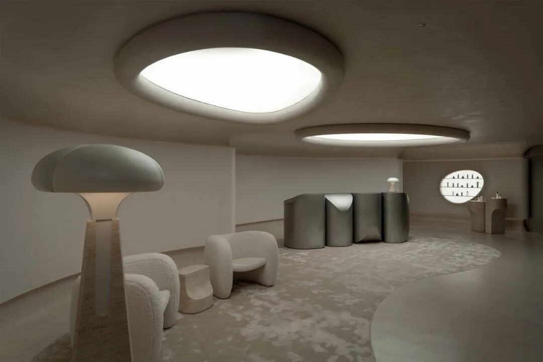 The reception room has a scene. A cave -shaped structure is closely related to nature, inspired by the delicate curve and softness of mushrooms. This vernacular is expressed throughout the design.