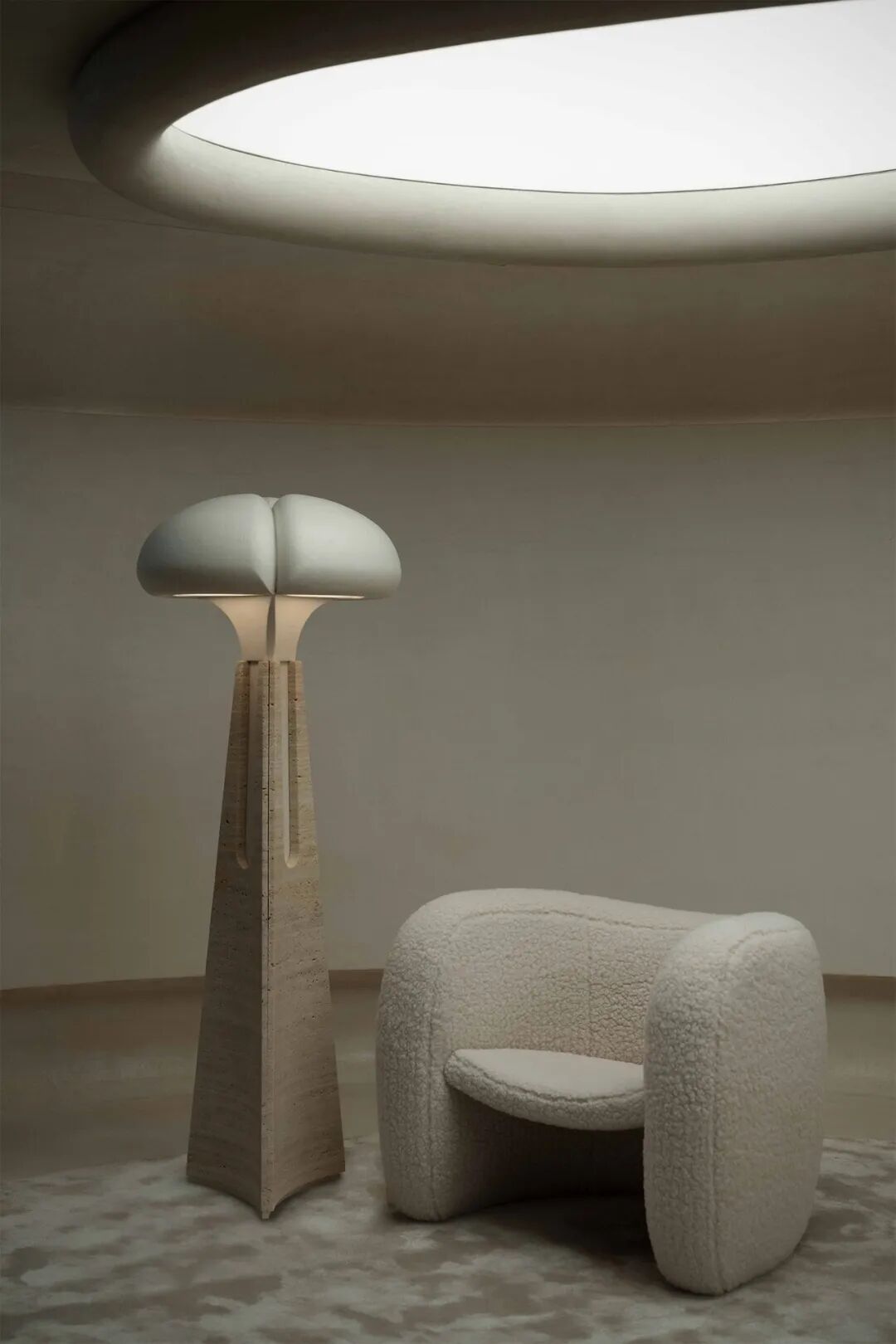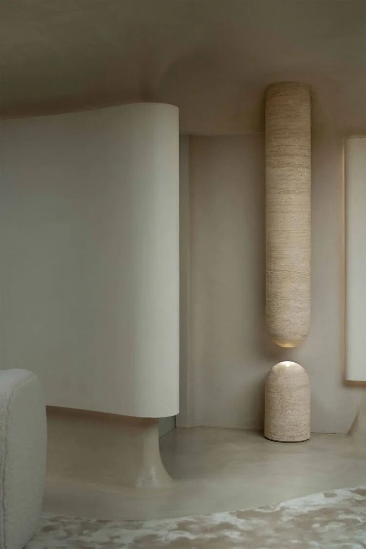 接待休息室设置了场景,一个洞穴状的结构与自然的紧密联系,灵感来自蘑菇的精致曲线和柔软度。这种白话在整个设计中都得到了表达。
