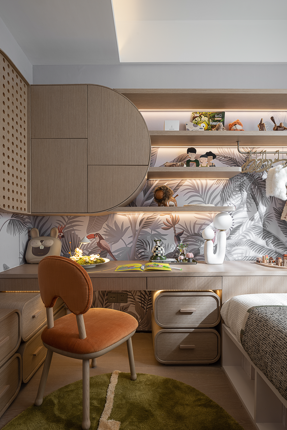 去海洋,去天空,去森林探索生命的奥妙,是每个小朋友对世界的好奇和浪漫想象。幻想的起点从自己的房间开始,热带森林壁纸,小动物摆件,勇敢可爱的卡通小像在她们的脑海里充满生命和魔力,也给她们的成长赋予勇敢和力量。