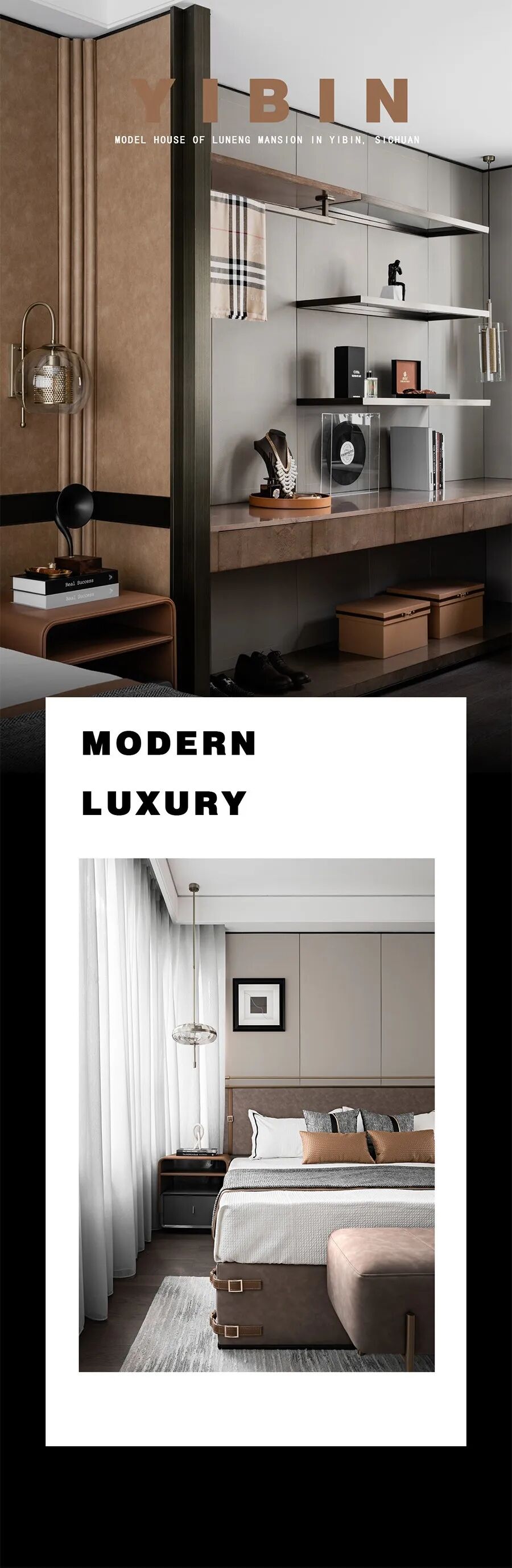 次卧低饱和皮革背景,咖色的床品点缀,优雅的色调表达出平和的氛围,是历经沧桑后的淡然。