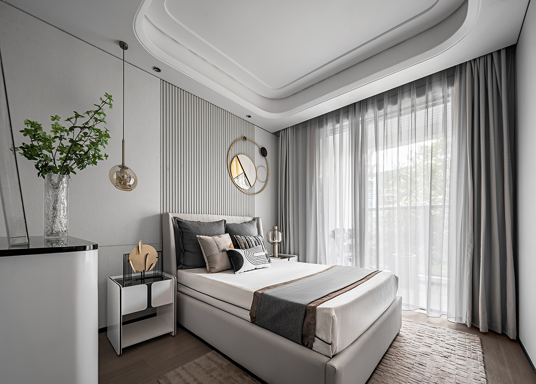 主卧墙面波纹造型饰面、这些细节更使整个空间具备现代主义设计感,体现空间简约而时尚的氛围。
