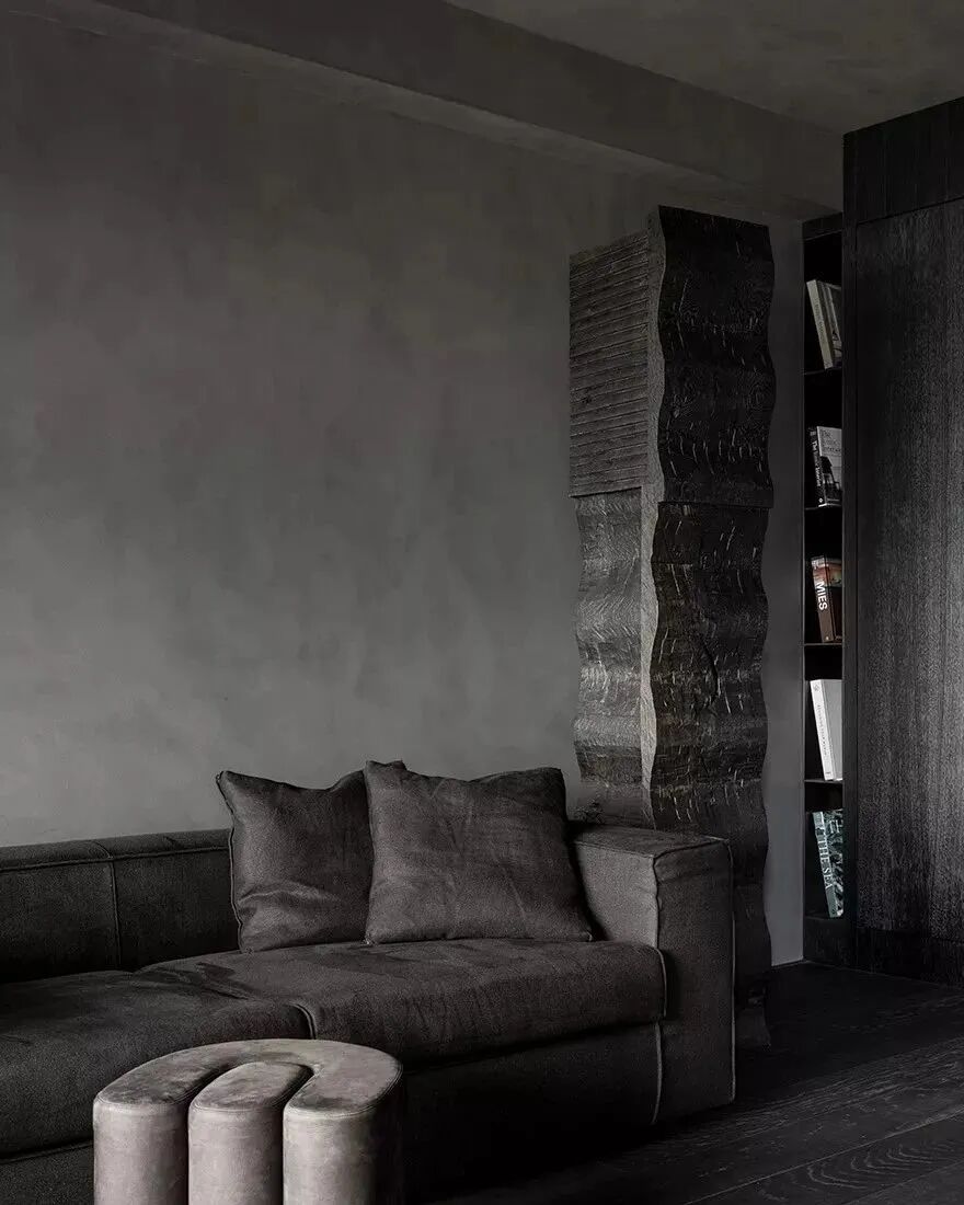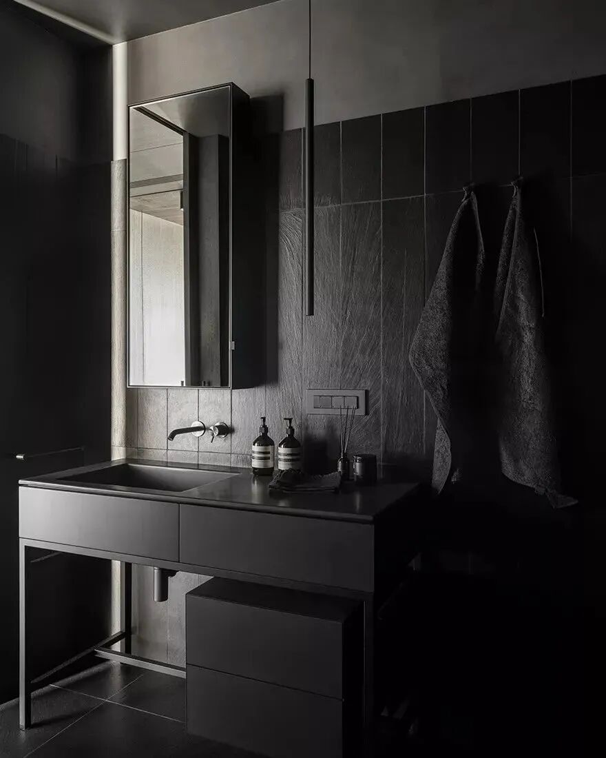 Tatyana 和 Vladimir 在个人触觉的指导下选择了装饰材料。黑色凹凸不平的石板、工程拉丝板、抛光金属、用于墙壁和天花板的微水泥采用深色石墨色调 - 所有这些都类似于海崖。