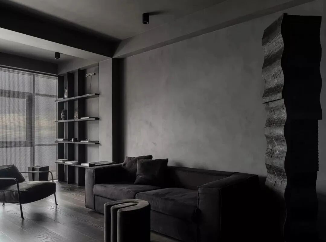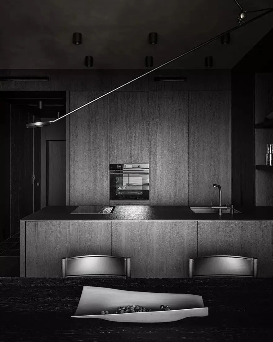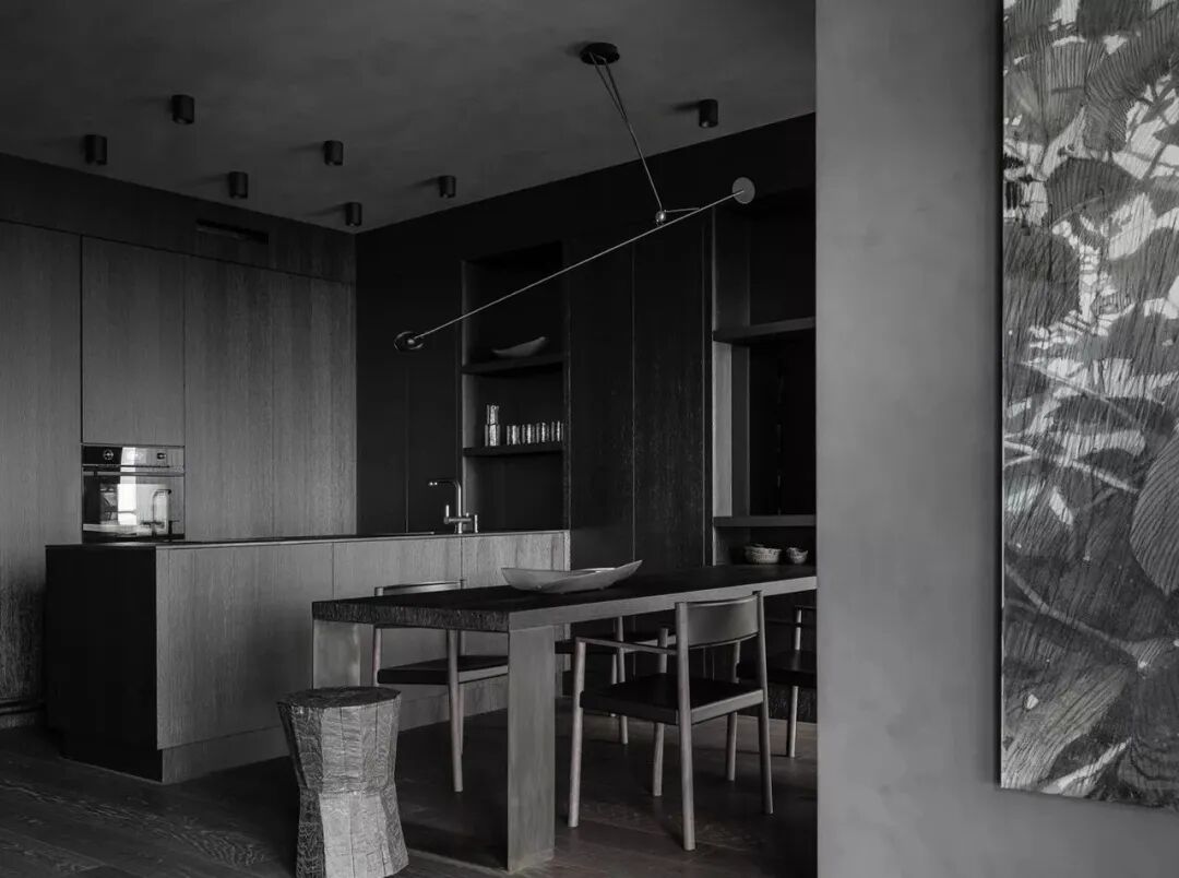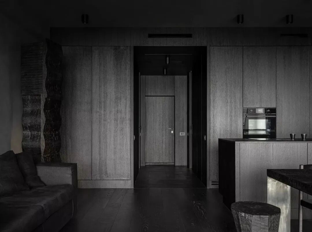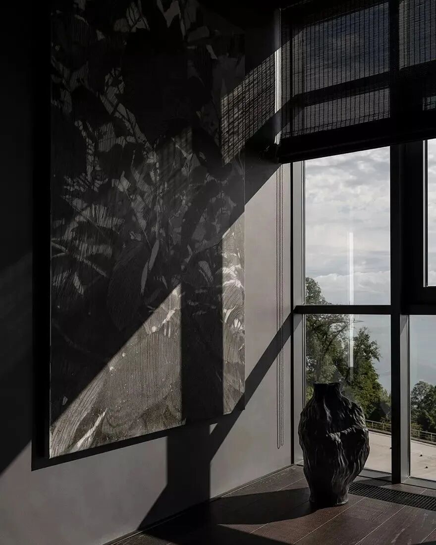 正如设计师所设想的那样,公寓的内部将成为这种自然美景的一个薄薄的框架。为了达到这种效果,选择了黑色作为主色。它在墙壁、天花板、家具和其他元素上深沉而复杂的色调为窗外的无尽距离创造了框架效果。