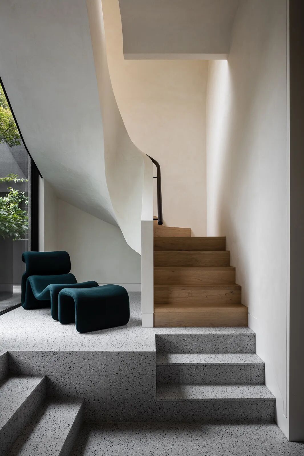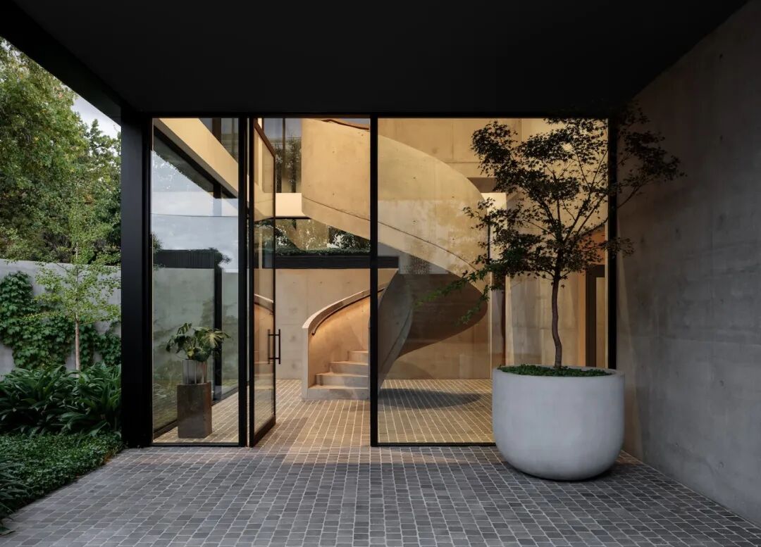 连接各层的混凝土雕塑楼梯是一种工艺和流畅运动的陈述,与入射光相互作用。