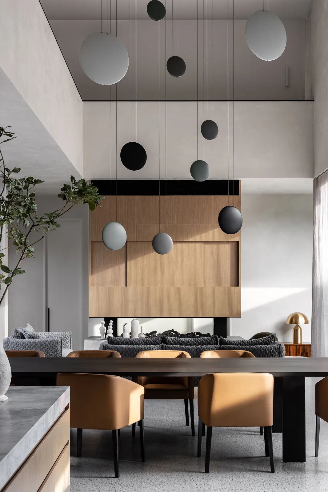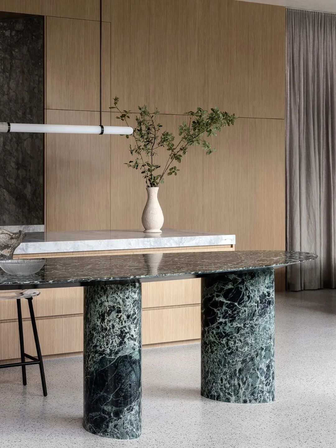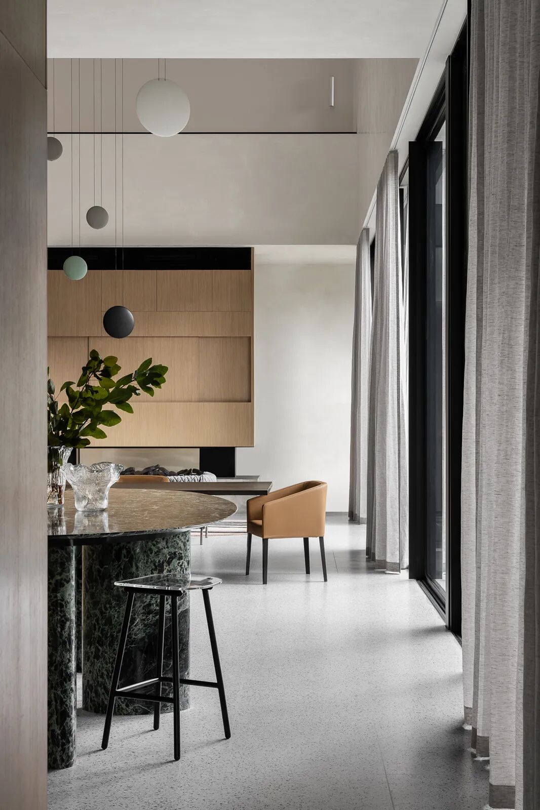脚下的毛绒地板和家具中使用的纺织品系列完善了这幅画,并开始体现熟悉的家的感觉。虽然与住宅的最初互动暗示它是一座公共建筑或画廊,但一旦进入室内,整体的庄严感就会通过更容易辨认的住宅线索得到转变。