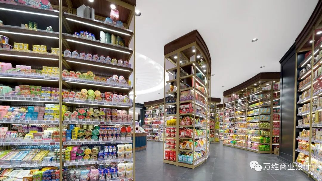 休闲零食区域以通高的环形货架设计,形成一个半围合的小型馆中馆,陈列各类网红休闲零食。