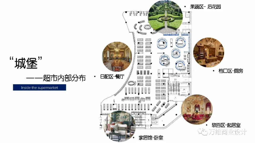 进入空间中,“城堡”内的结构分别落位于超市的各个区域,与商品产生关联性。卧室,餐厅,厨房,起居室等分别落位于家居馆,日配,档口,软百等区域。结构丰盈的拱券造型,强劲有力,让空间变得秩序井然。