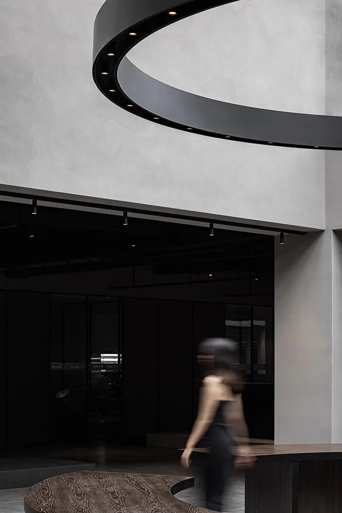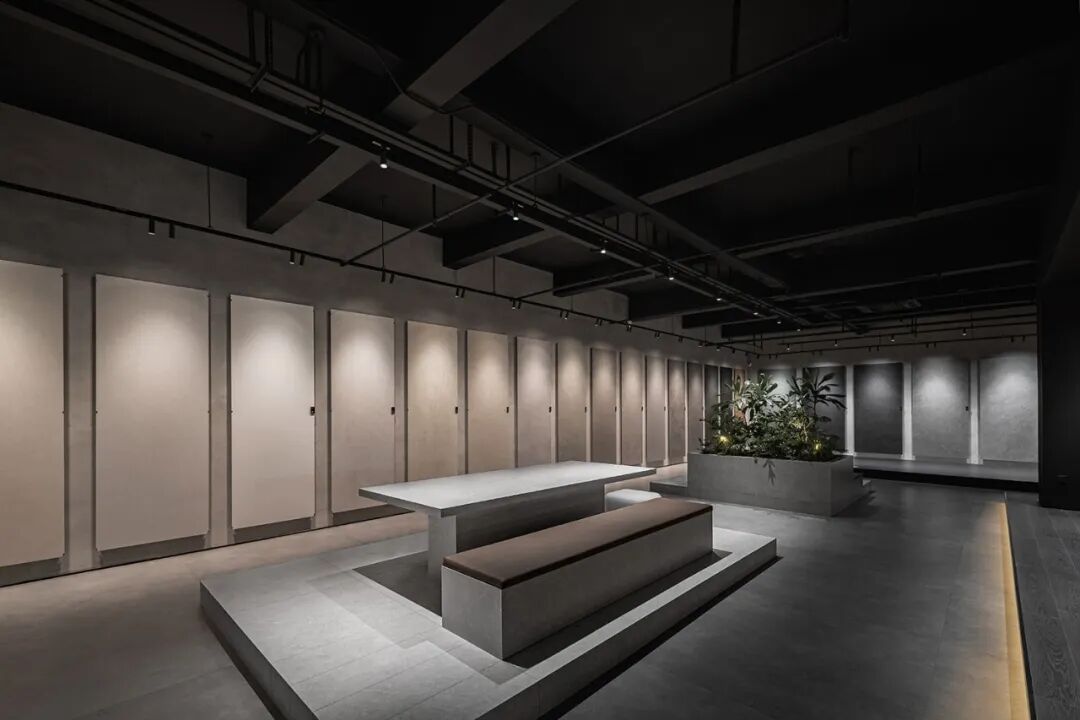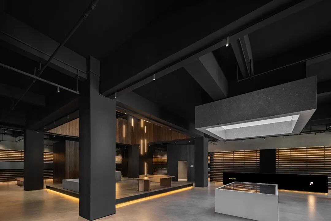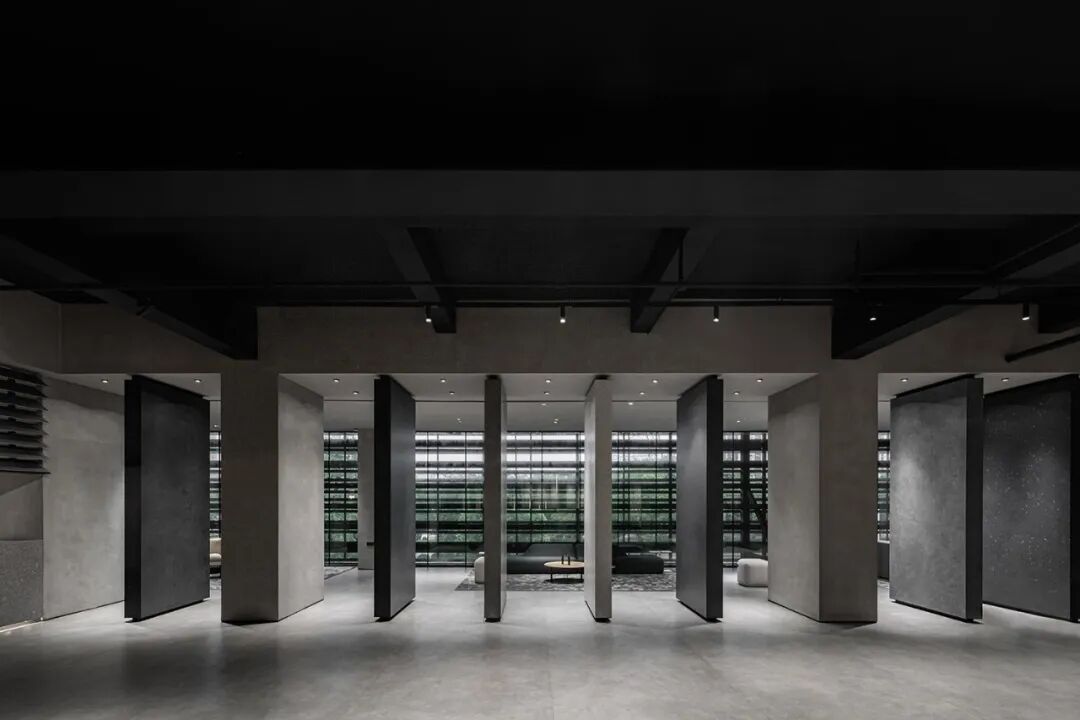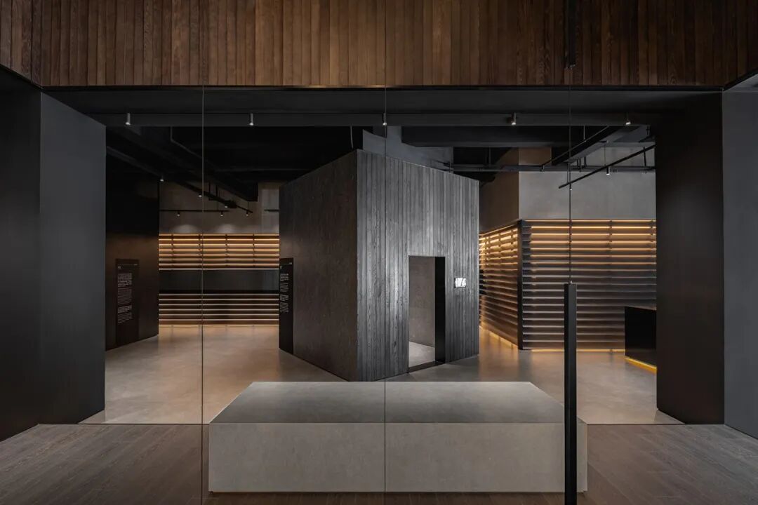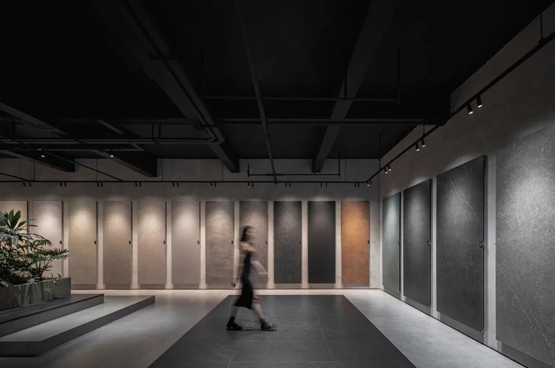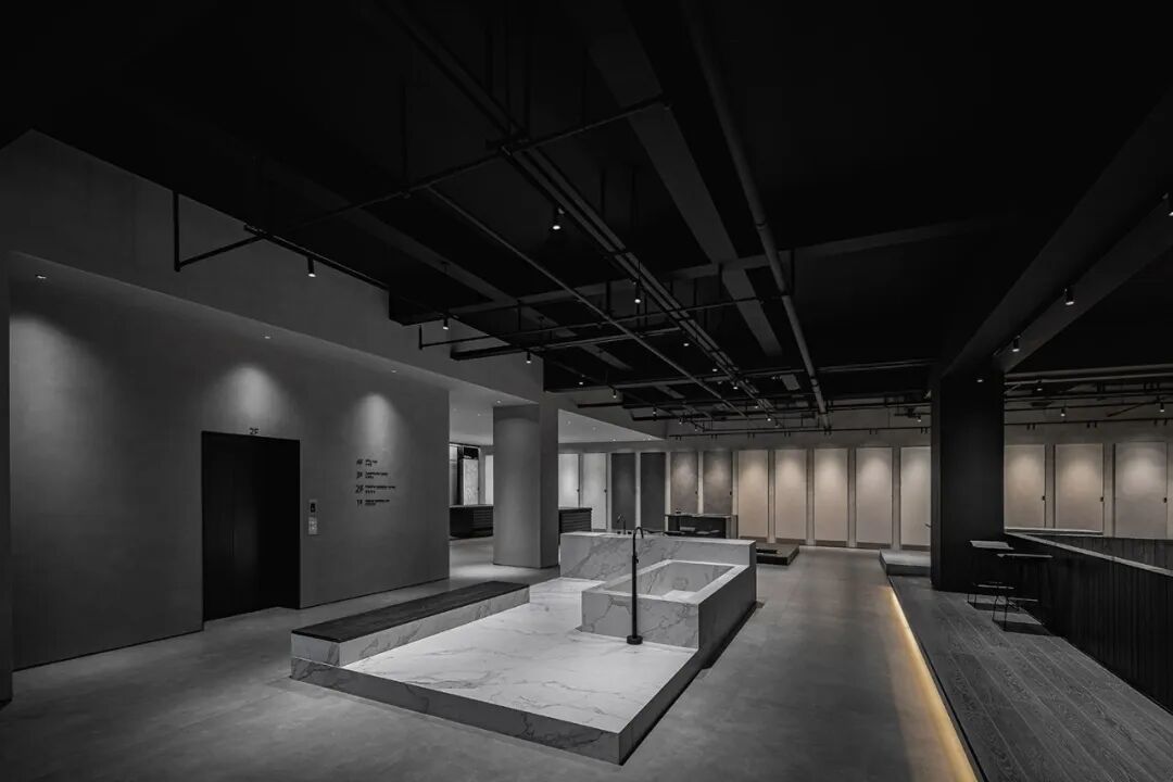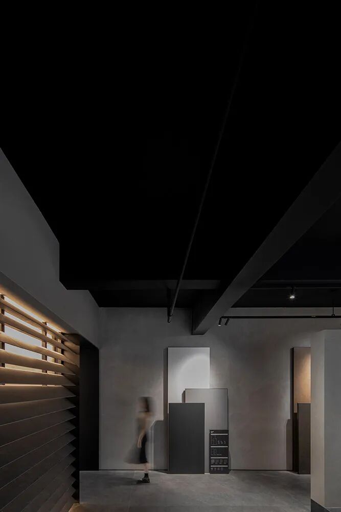 一层空间,采用博物馆的陈列方式,延续每个空间独立的思想,从大门口进入展厅,感受着跟传统的陶瓷展厅不一样:独立的空间组合,在这整体的设计中,围合着同一份“气”,隐而神秘,构筑成方向家居美学馆独有的“场”。
