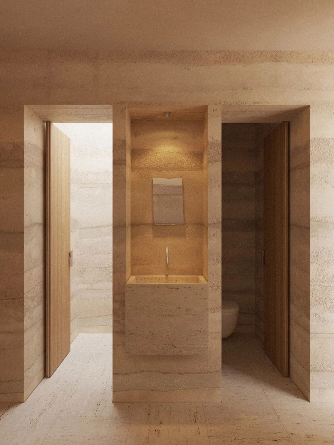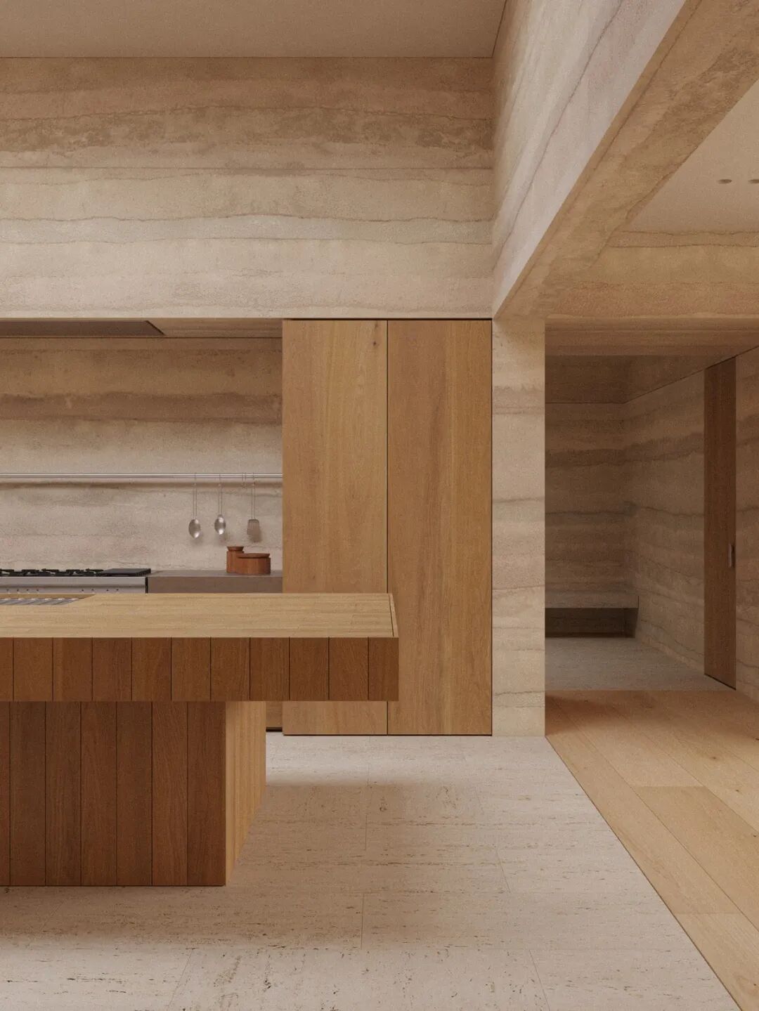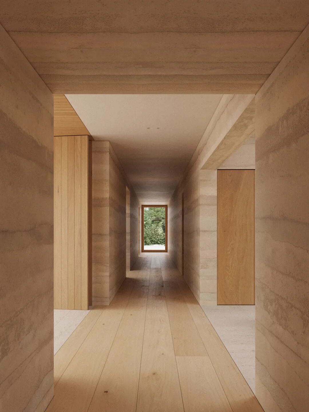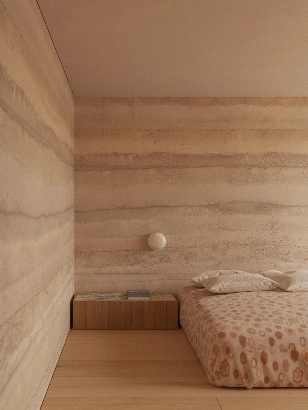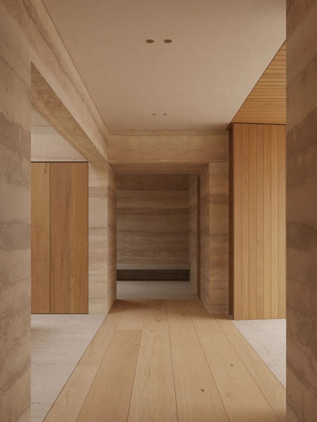 The walls of this residence are made with rammed earth and left bare conveying the idea of the house “emerging” from the landscape and blending with its surroundings in a very natural way. Inside, the rammed earth is accompanied by natural wood giving warmth and coziness to the general atmosphere, contrasting the stillness and coolness of the walls and travertine elements.