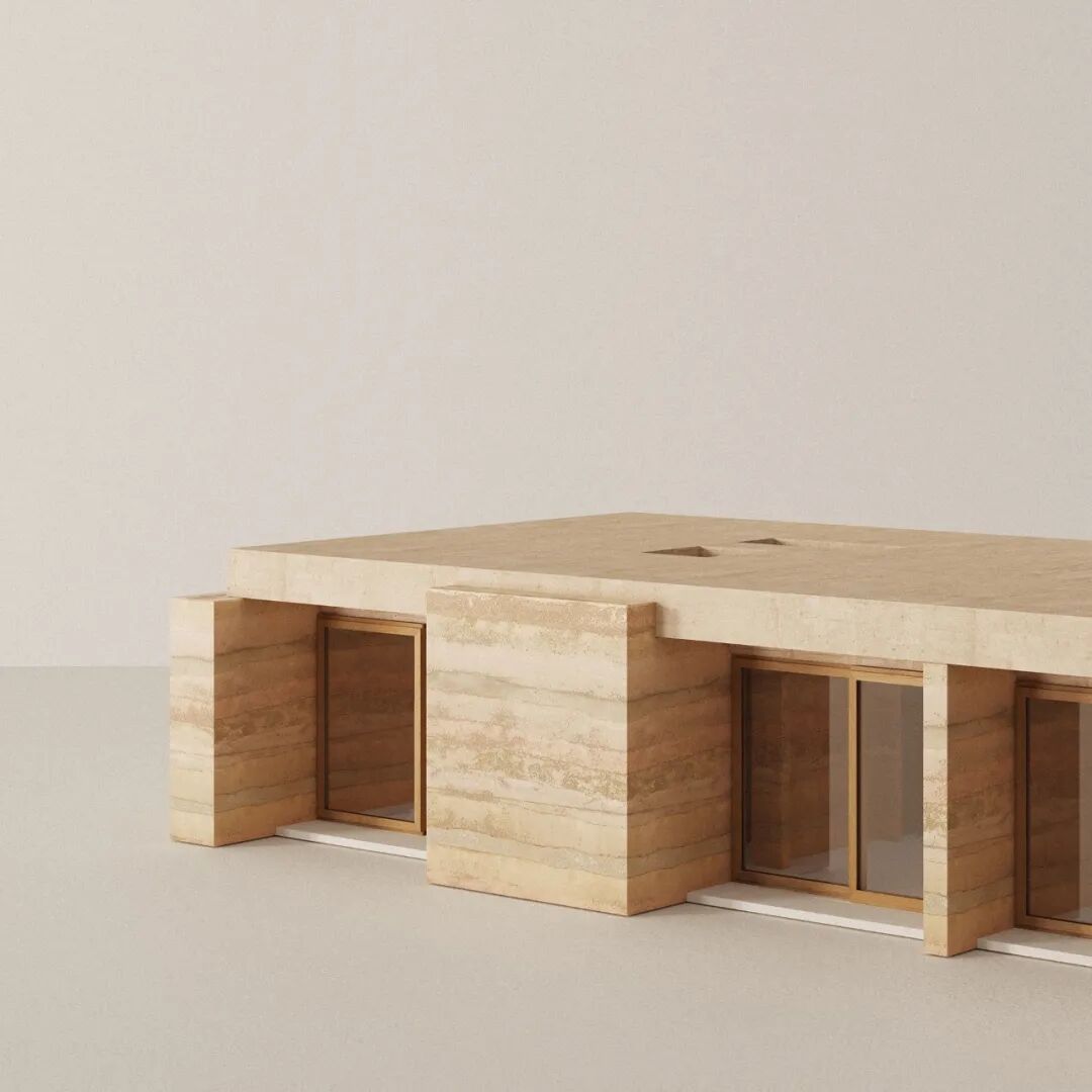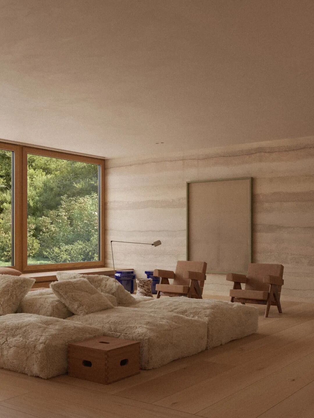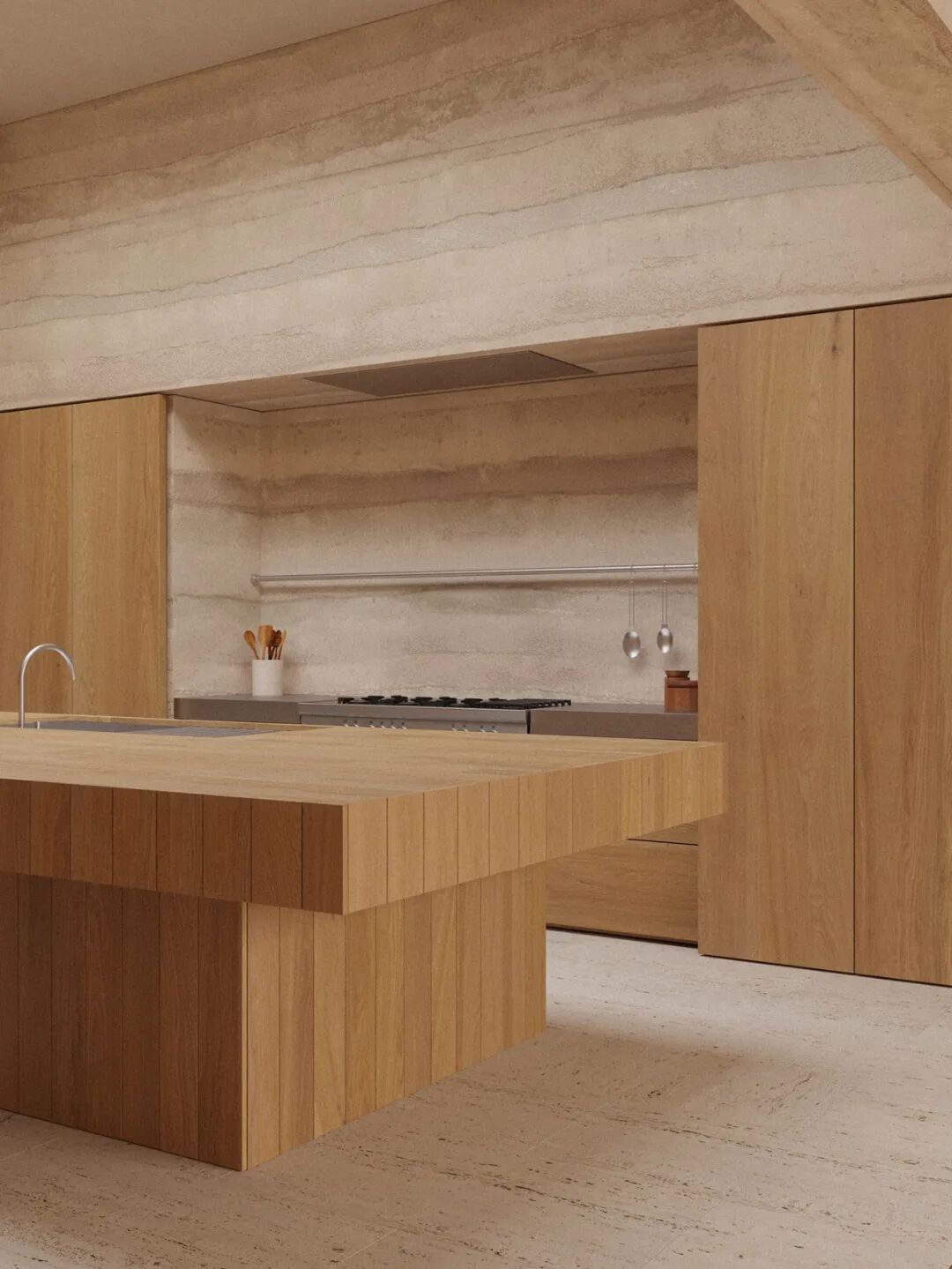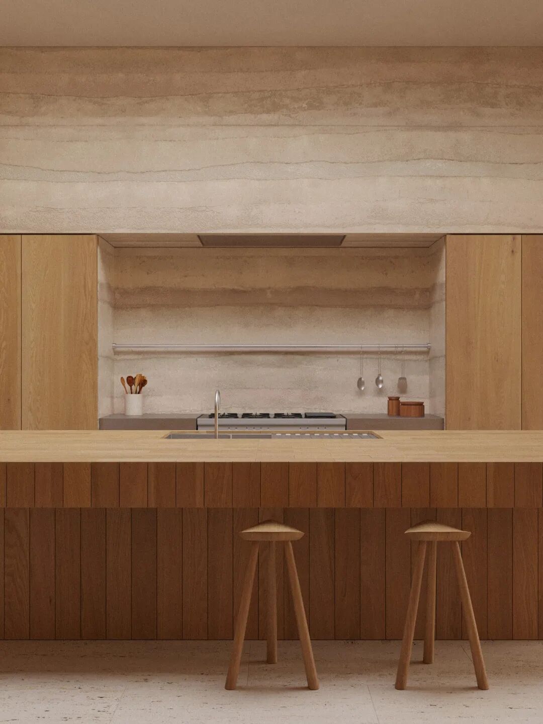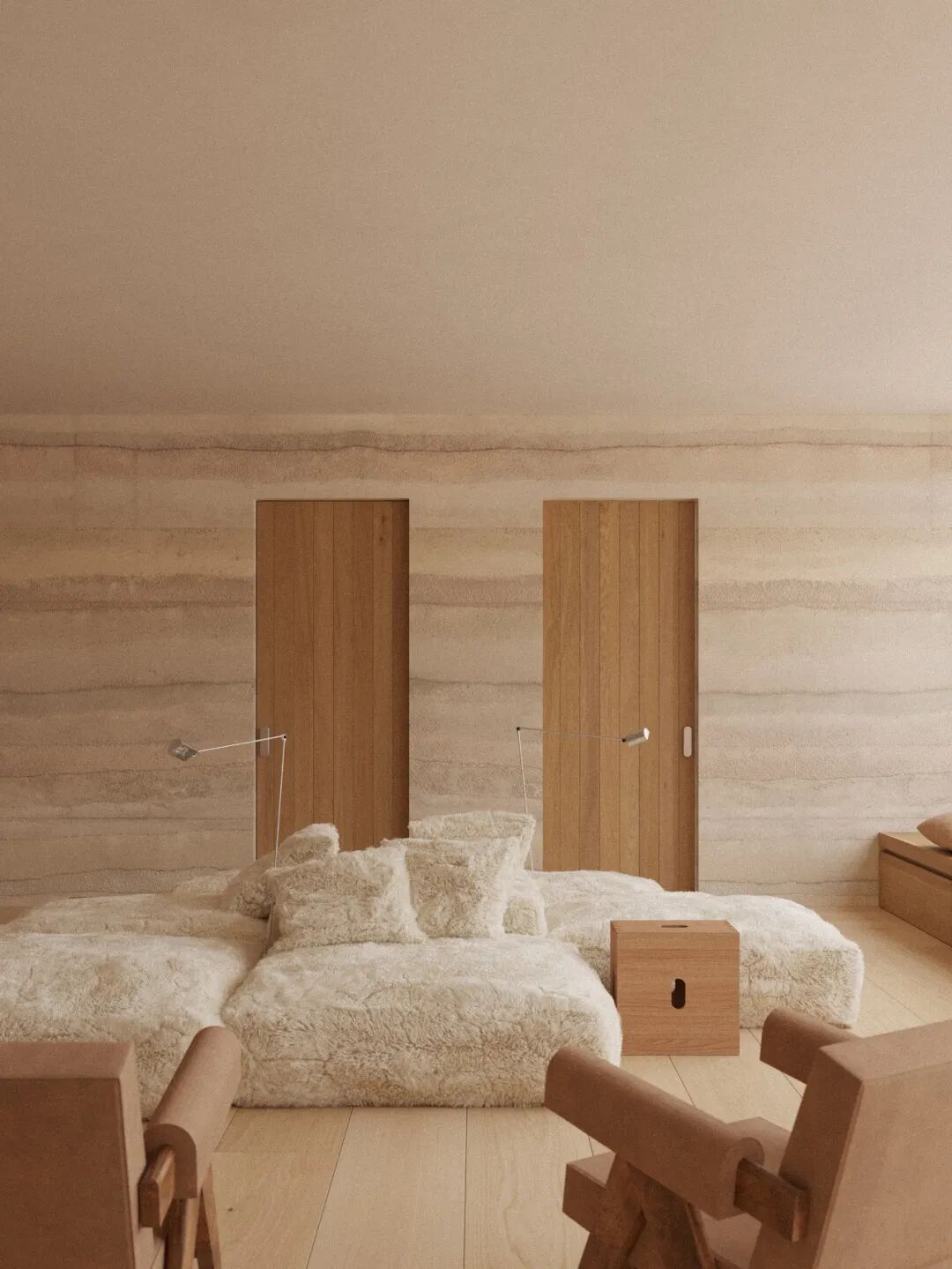 The walls of this residence are made with rammed earth and left bare conveying the idea of the house “emerging” from the landscape and blending with its surroundings in a very natural way. Inside, the rammed earth is accompanied by natural wood giving warmth and coziness to the general atmosphere, contrasting the stillness and coolness of the walls and travertine elements.
