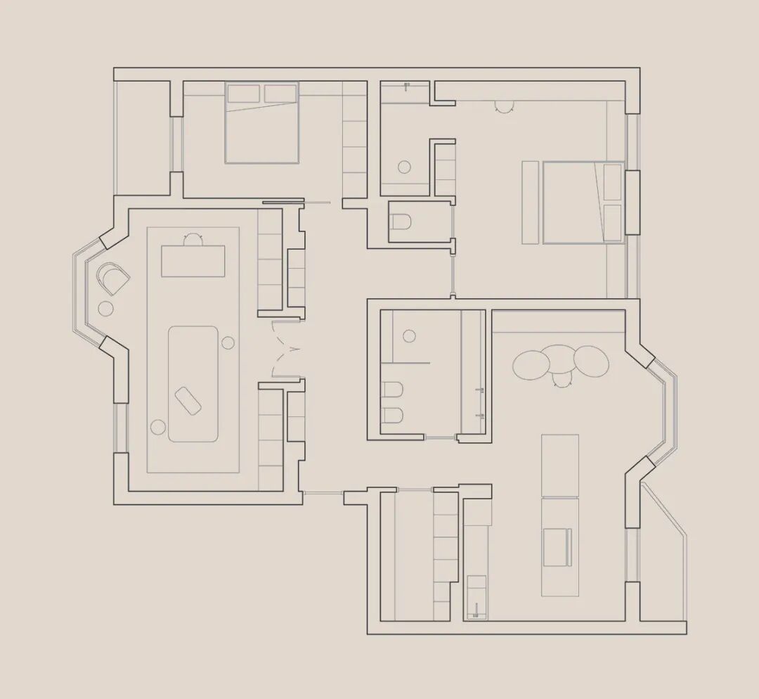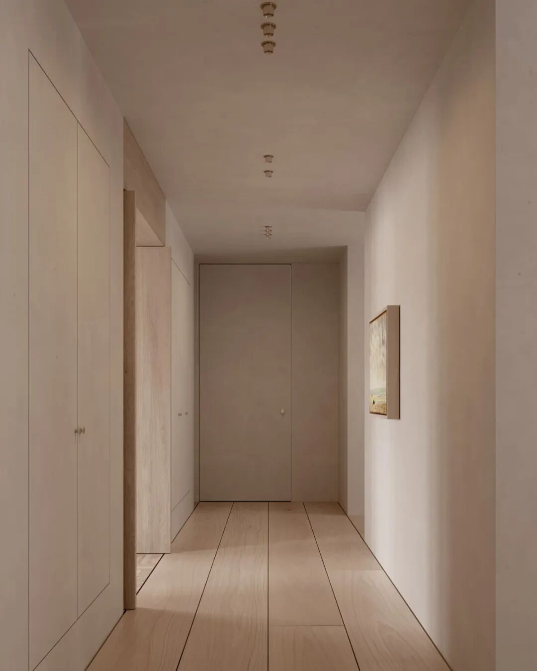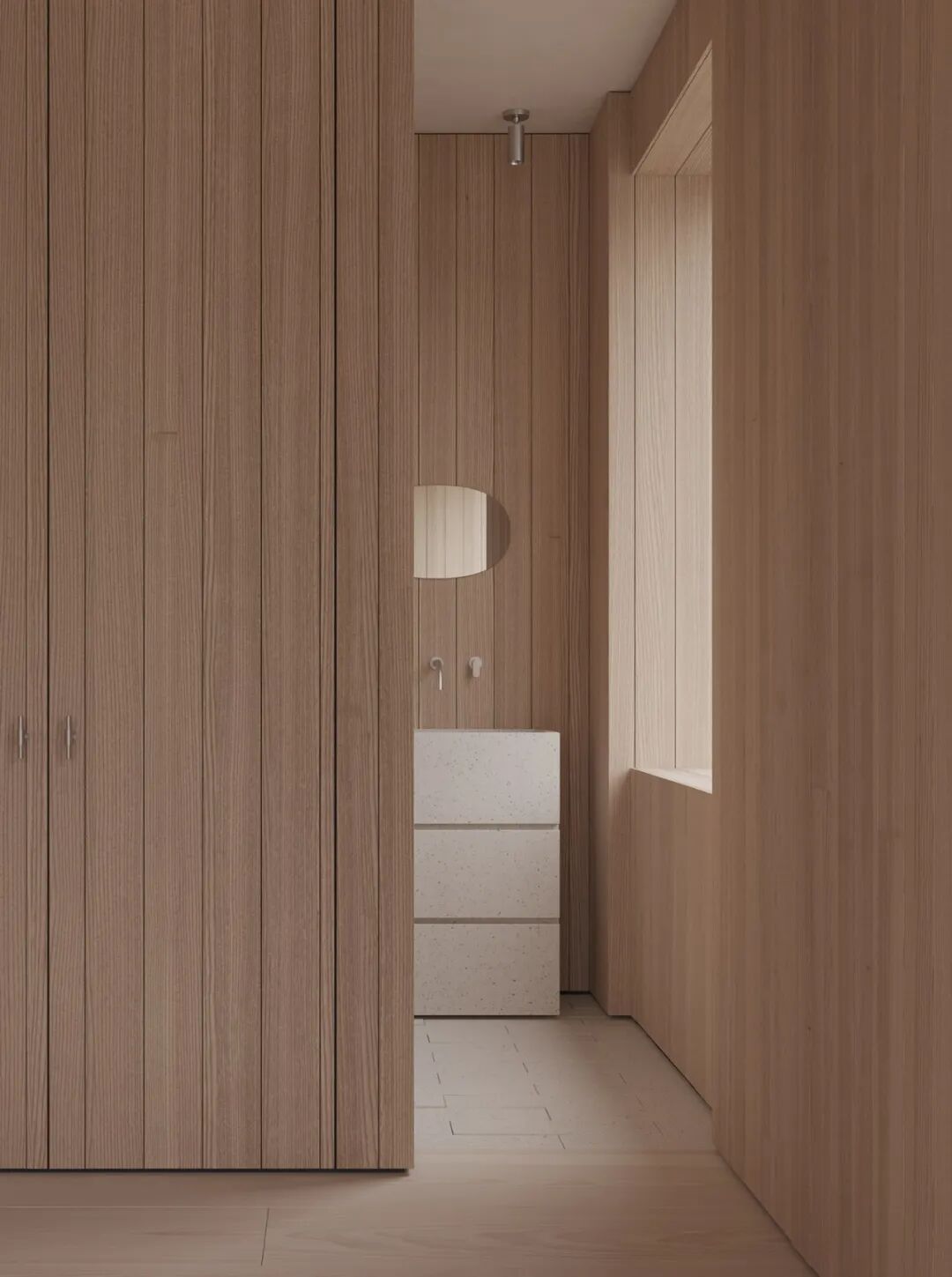该公寓位于一个公寓楼中,大部分窗户都朝向其他窗户。代替窗帘的是由木框和半透明布组成的面板。面板固定在开口中,但必要时可以轻松卸下。面板使设计更清晰,并营造出一种从城市景观中抽象出来并专注于私密空间的安全氛围。