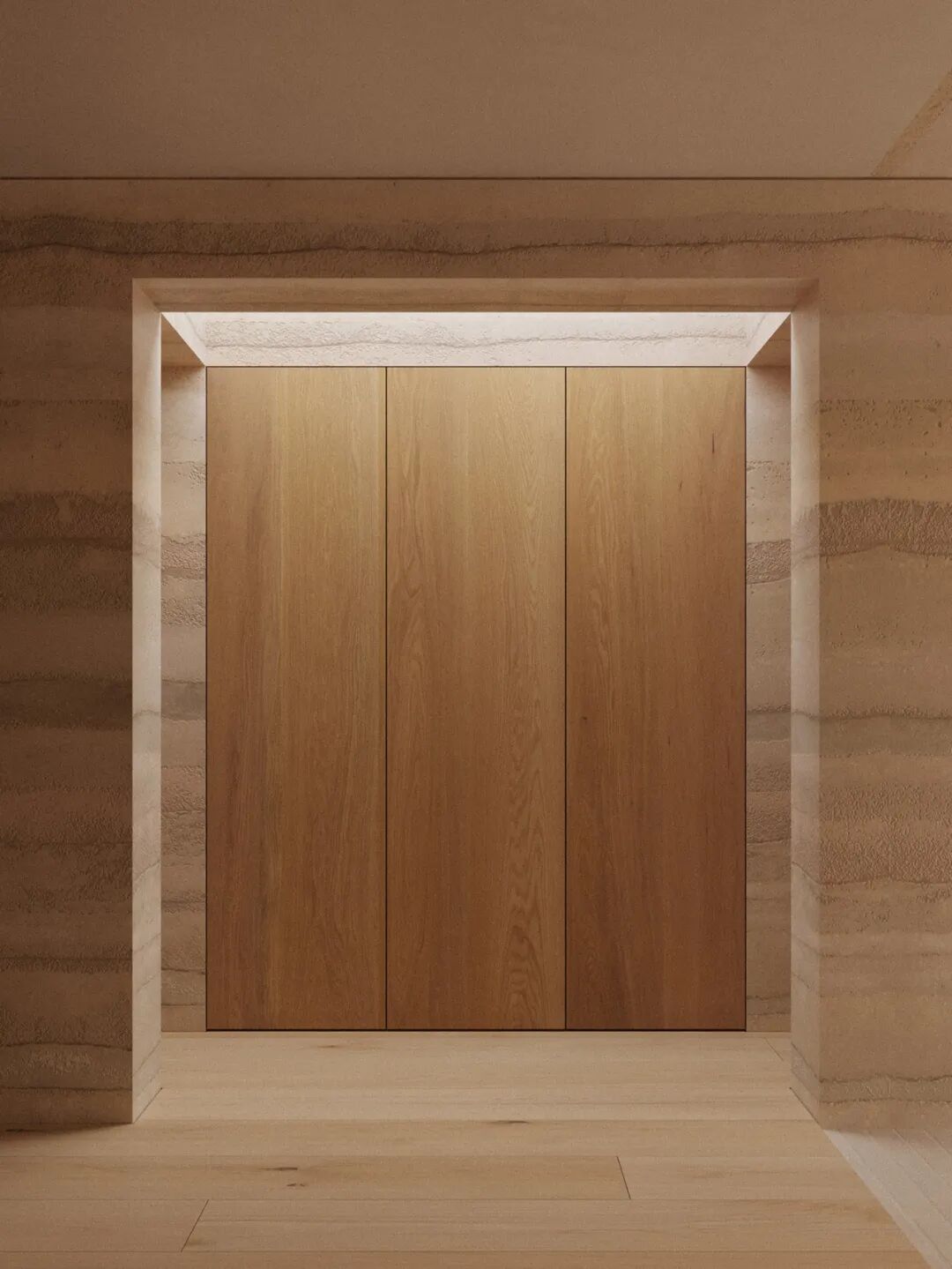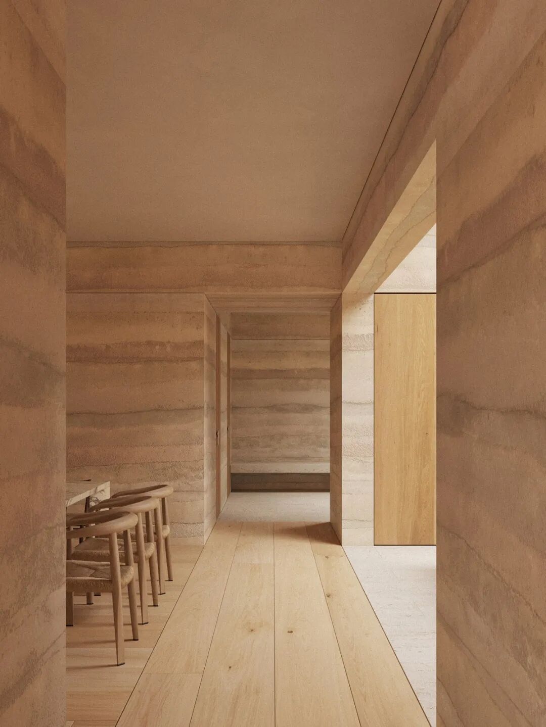这个住宅的墙壁是由夯土建造,与景观和环境以一种非常自然的方式融合。内部,夯土与原木给人温暖和舒适氛围,与之形成对比的是,墙面的石材元素带来的宁静和清凉感。