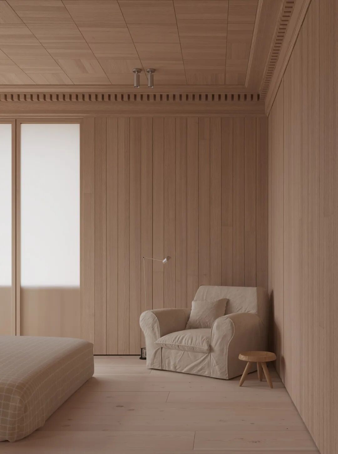 卧室希望是开放而舒适的。盥洗台和淋浴间没有隔板:通过衣柜在视觉上将它们与卧室隔开。卧室里有一个带大型舒适扶手椅的阅读角。整个空间由木头制成,温暖而舒适。