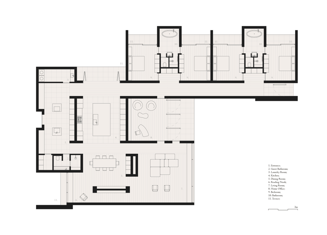 本住宅分为三个部分:核心区与公用房间,厨房,和家庭办公区;卧室区有四间卧室和两个洗手间,和生活区域,餐厅,阅读区链接,材质变化有意减弱,增强紧密性。
