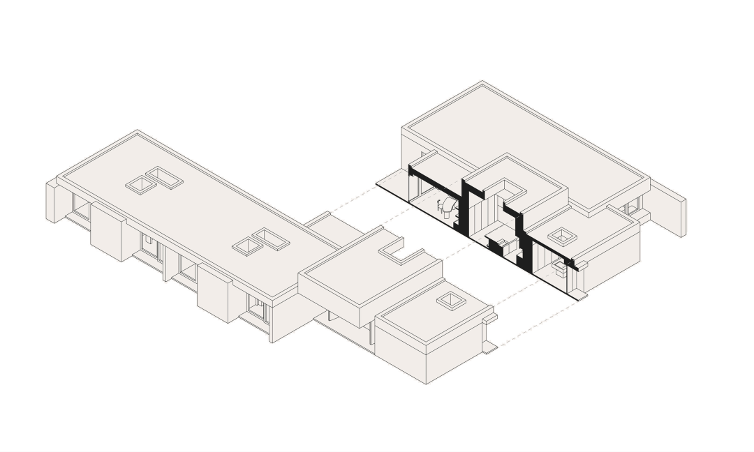 The house is divided into three volumes: the central volume with utility rooms, the kitchen, and the home office; the sleeping quarters with four bedrooms and two bathrooms; and the living quarter with the living area, dining room, and library. The material pallet is intentionally subdued.