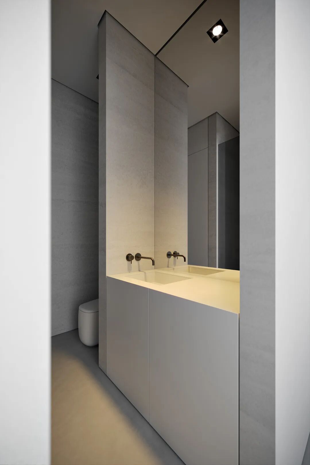 极简主义美学贯穿整个室内。二楼还有另一个公共储藏室、两间带共用浴室的卧室和一间带独立浴室和衣柜的主卧室。