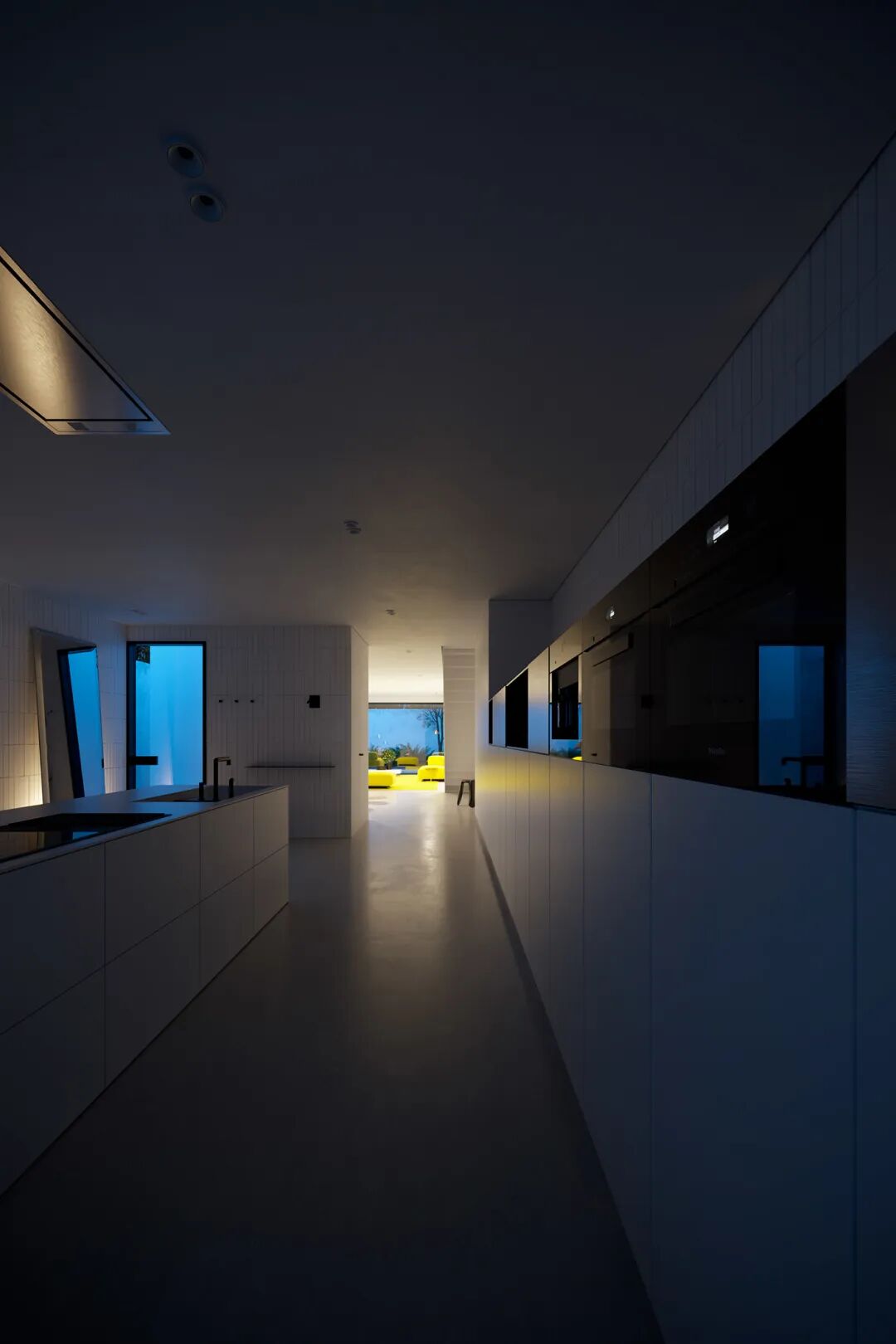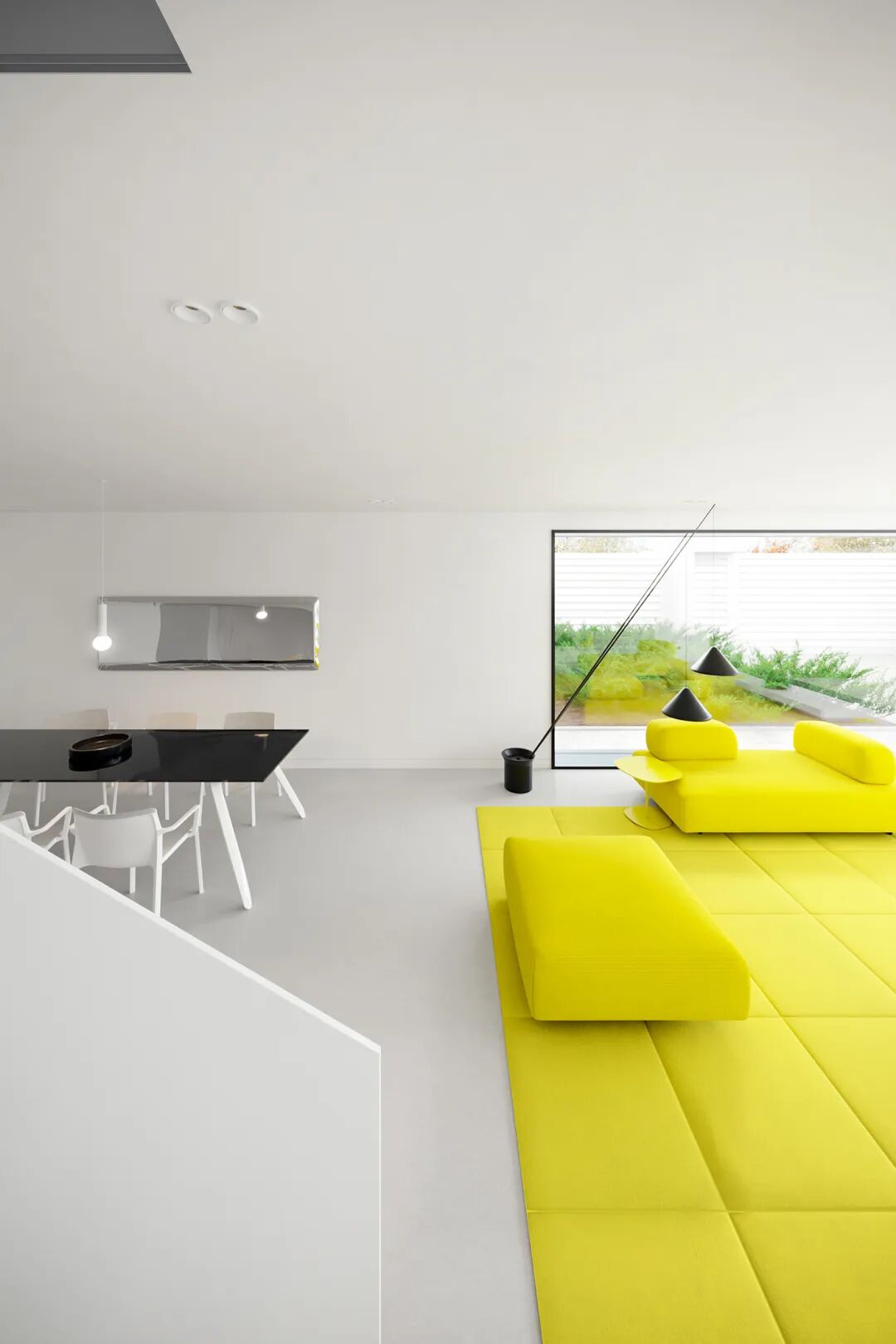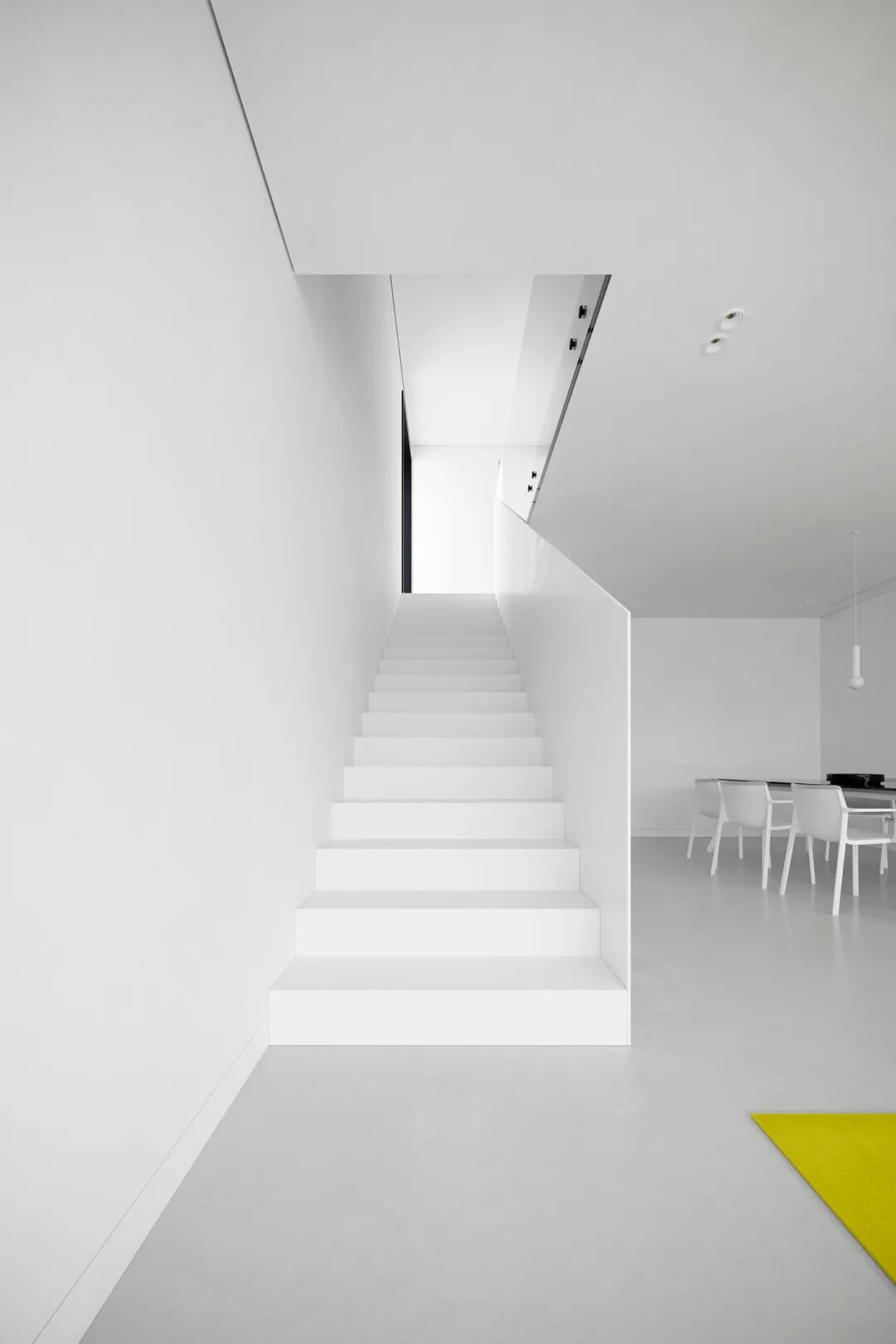这所房子被设计成最小的纯白色生活空间。它由两层和一个庭院组成。一楼有厨房、客厅和入口处的小更衣室,都是相互隔开的,但没有门。与白色形成对比的是明亮的沙发区和家具和灯具的深色元素,以及架子和桌子上整齐排列的配件。