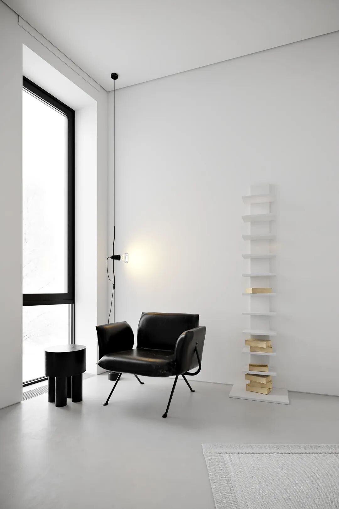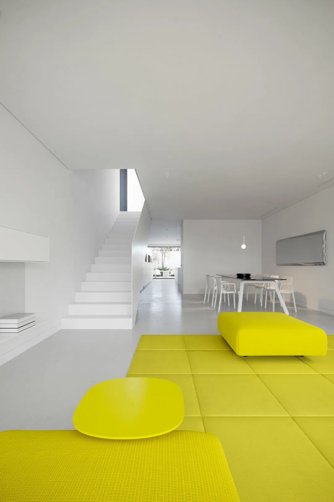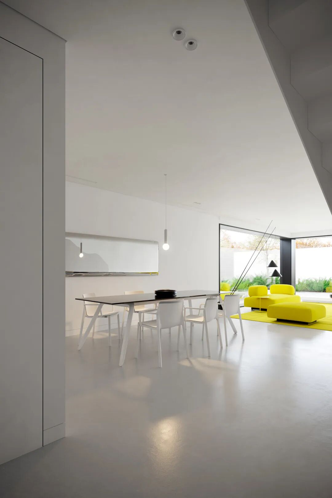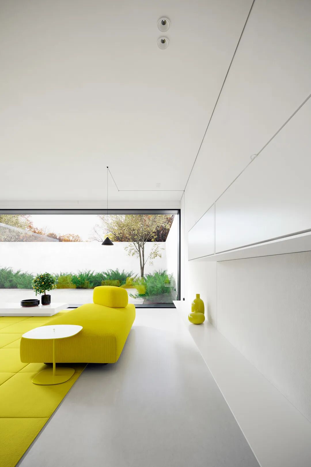 这所房子被设计成最小的纯白色生活空间。它由两层和一个庭院组成。一楼有厨房、客厅和入口处的小更衣室,都是相互隔开的,但没有门。与白色形成对比的是明亮的沙发区和家具和灯具的深色元素,以及架子和桌子上整齐排列的配件。
