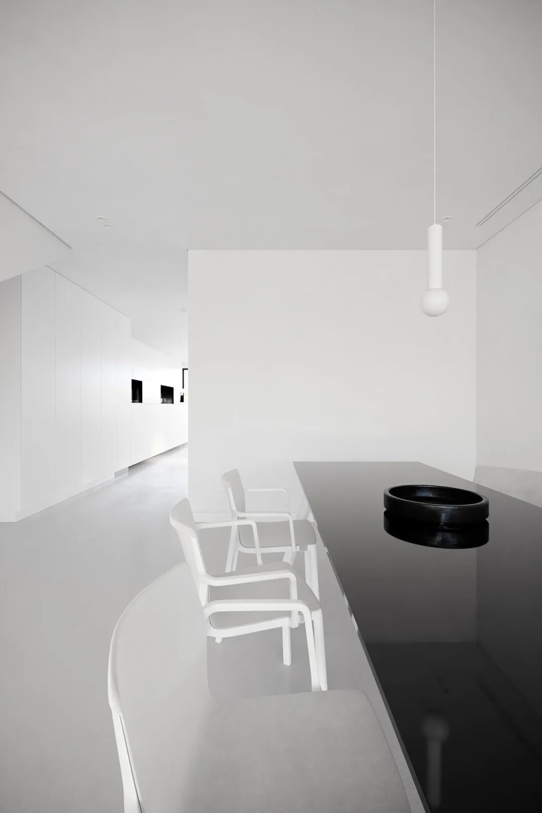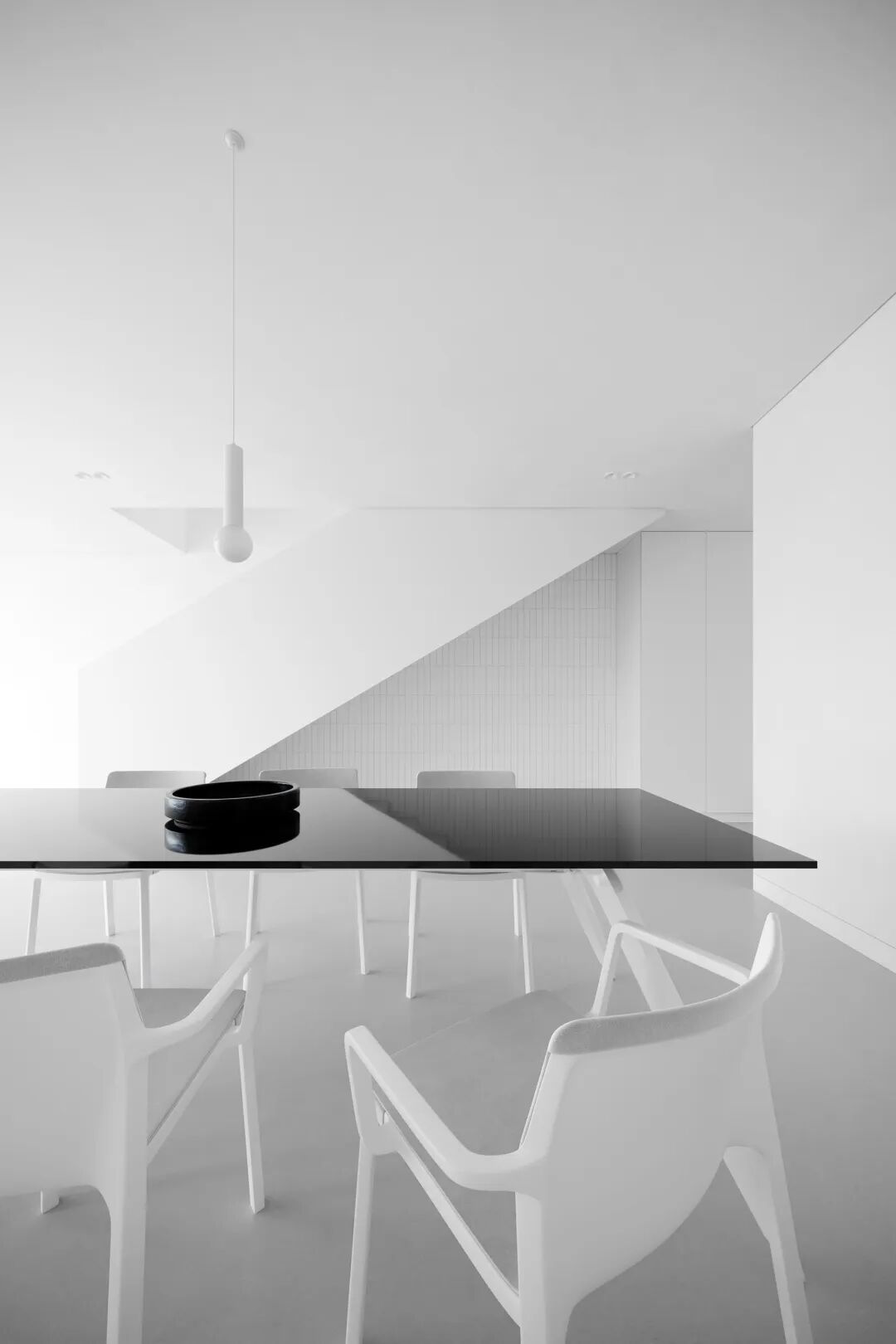 清晰的形式和直线使每个元素都以自己的方式表达,但同时它们又相互补充。用餐区相当苦行,但有一个黑暗的对比。