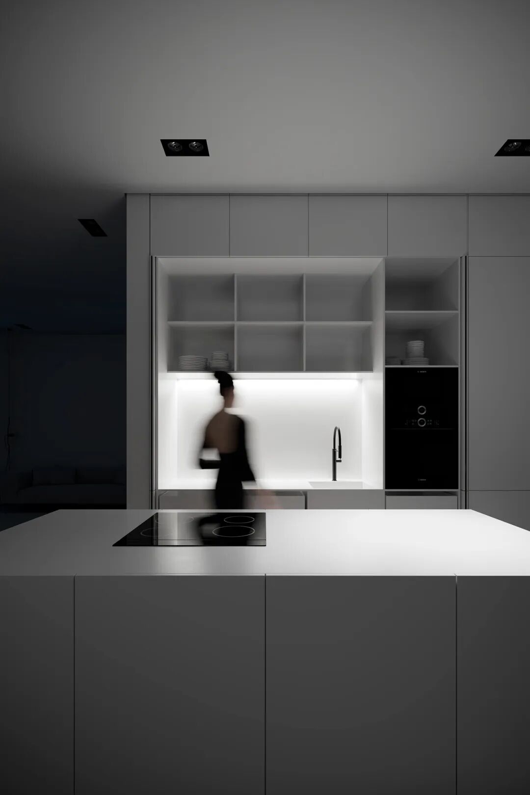 极致的黑白并没有让空间变得生硬、冷淡。空间通过灯光、曲线,营造出柔软温暖的氛围,让空间拥有人情味。