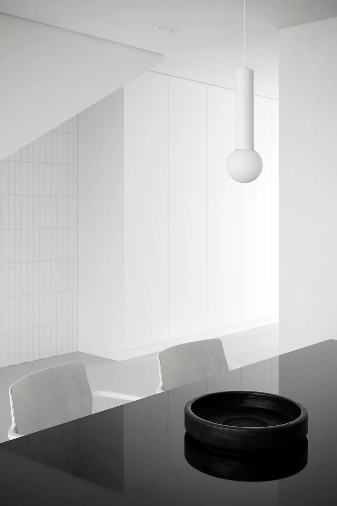 在厨房区域,几乎所有的表面和家具都使用白色,但也有一些明显的例外。在厨房里,橱柜占据了整面墙,连接着衣柜和楼梯。隐藏杂物,包括烤箱、咖啡机和冰箱。一般来说,厨房看起来简洁而复杂,但没有不必要的细节。在岛的上方,您可以看到一个大厨房抽油烟机。可用于密集烹饪,也可用作灯。