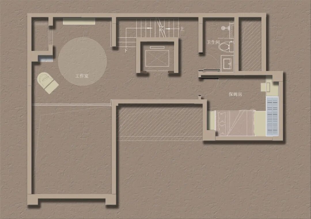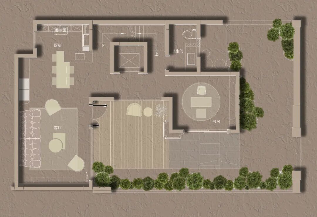 构造上,突破上下方向的隔阂与限制,使各层的平面布局彼此渗透。打通的挑高空间拓宽了视野,也带来了层与层间犹如互文的联动性。