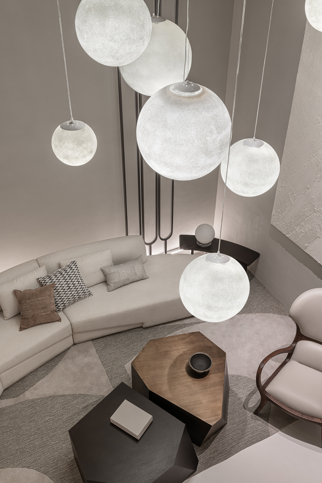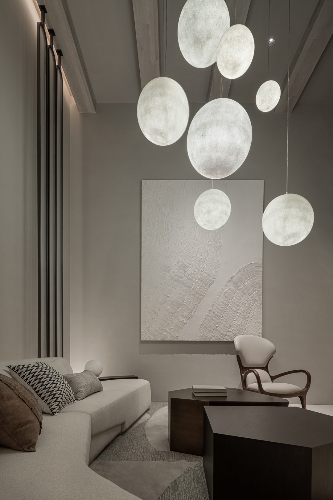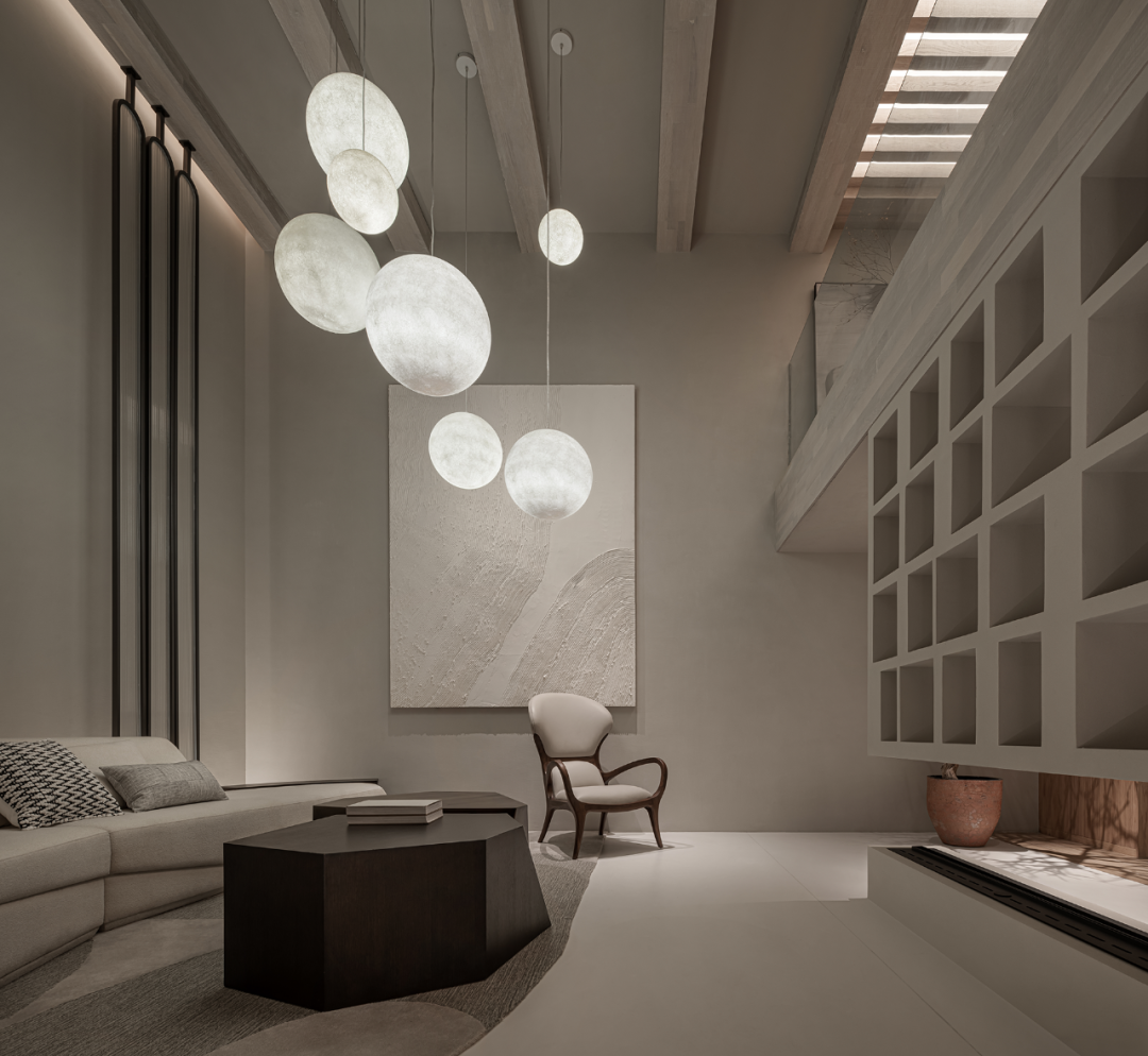 灯具如气泡或月光,轻轻盈盈,中和了原有的厚重与沉静,在上下两层空间内伸展贯通。