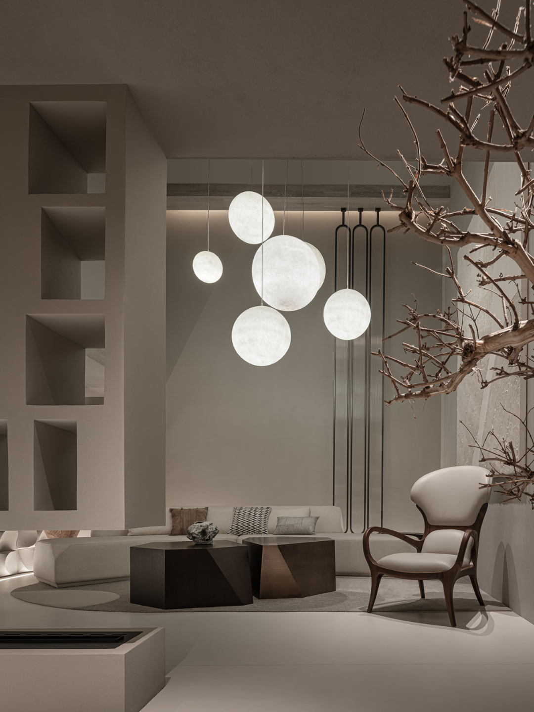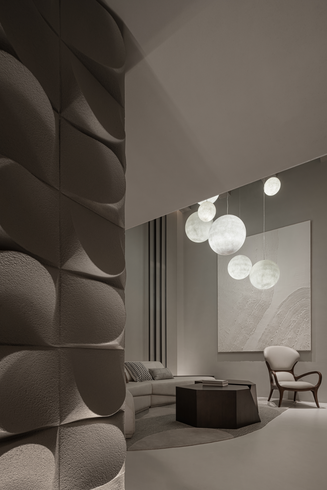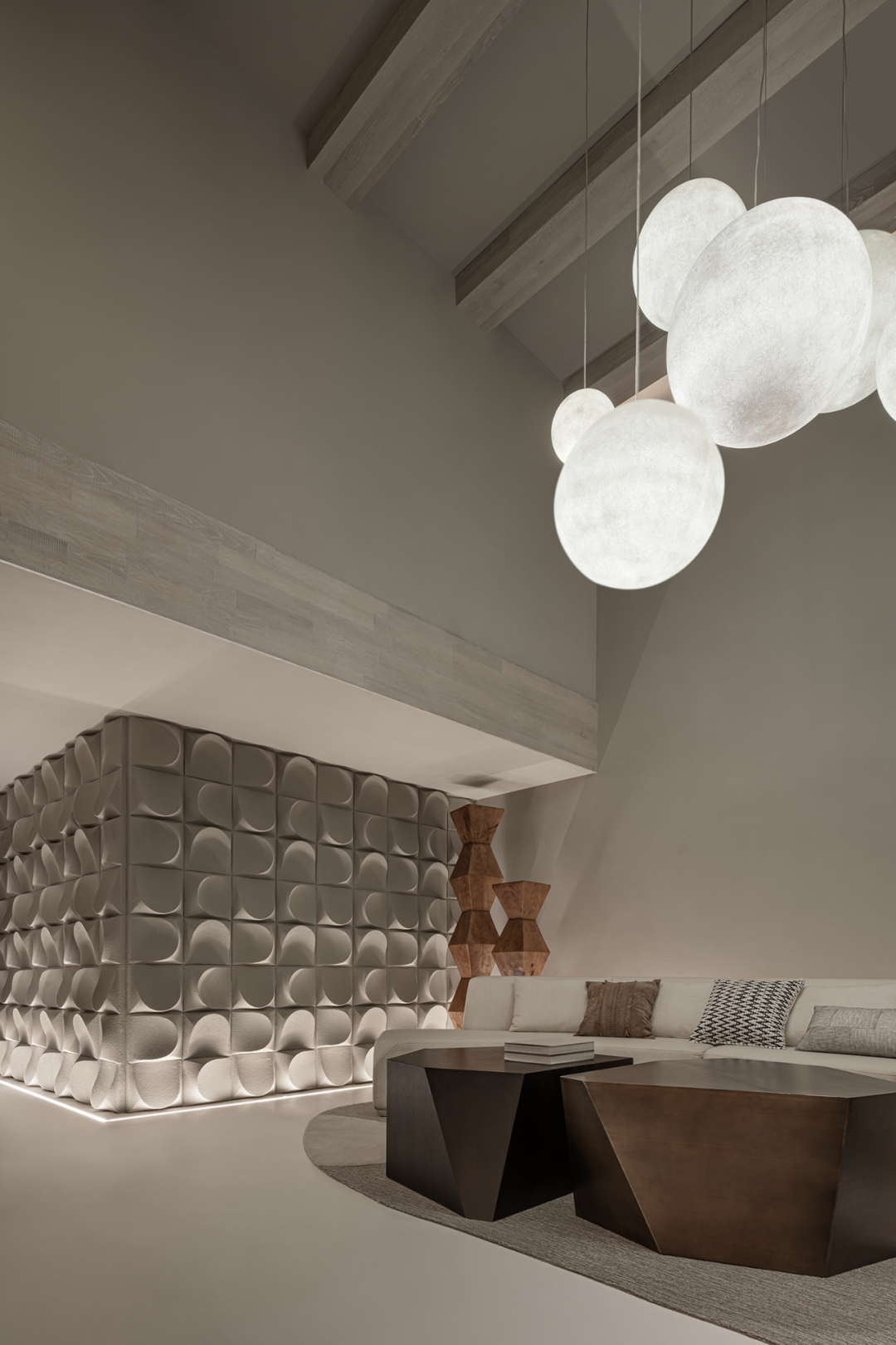 灯具如气泡或月光,轻轻盈盈,中和了原有的厚重与沉静,在上下两层空间内伸展贯通。