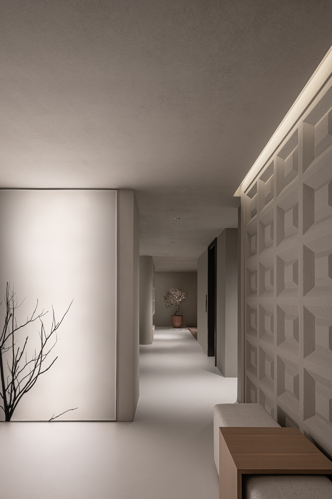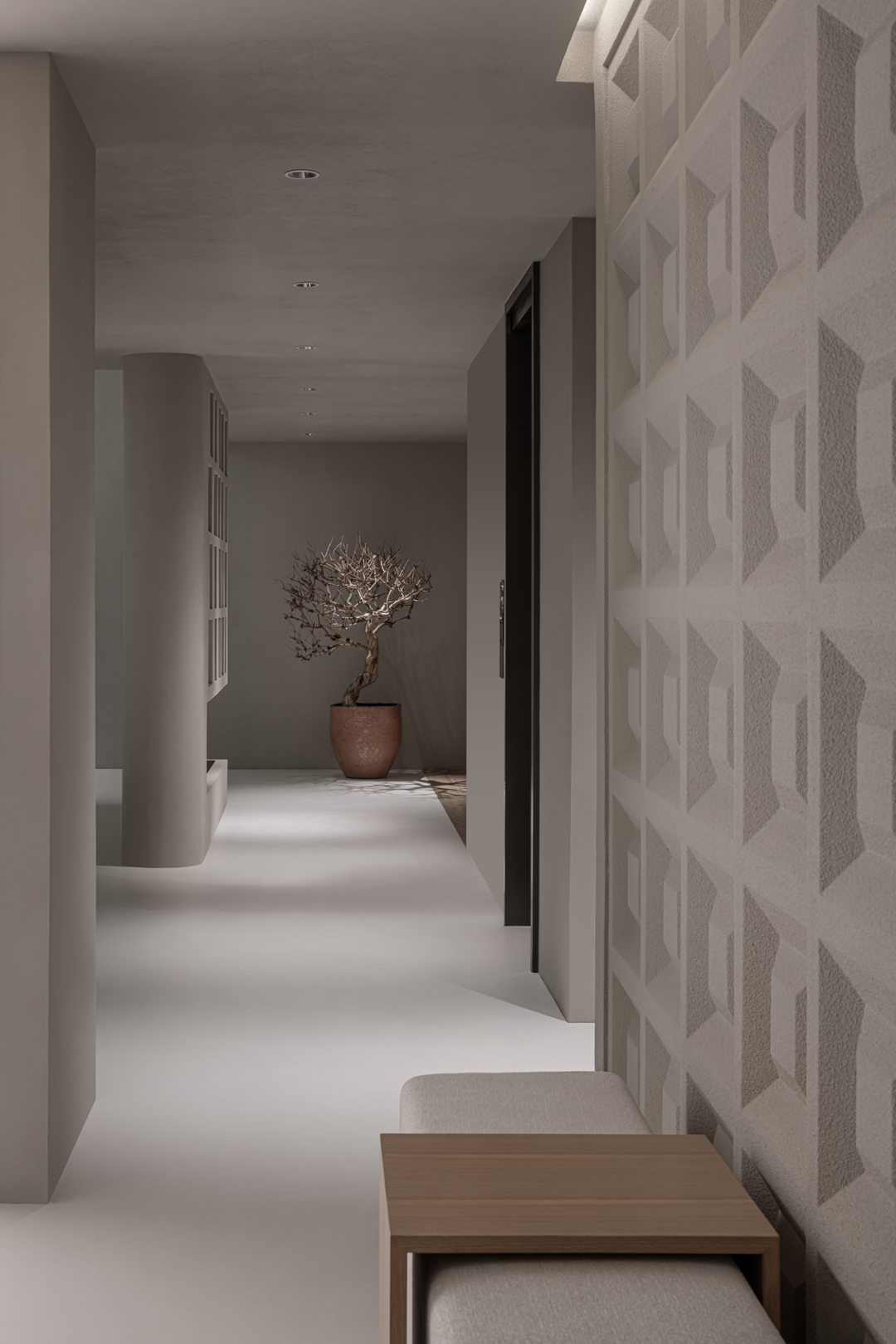 几何体块的节奏感之间,沙丘美学式的粗粝质感与质朴色彩,以光影为媒介,为画面增添厚度。不规则镂空玄关,在安全感与通透性之间寻求平衡。