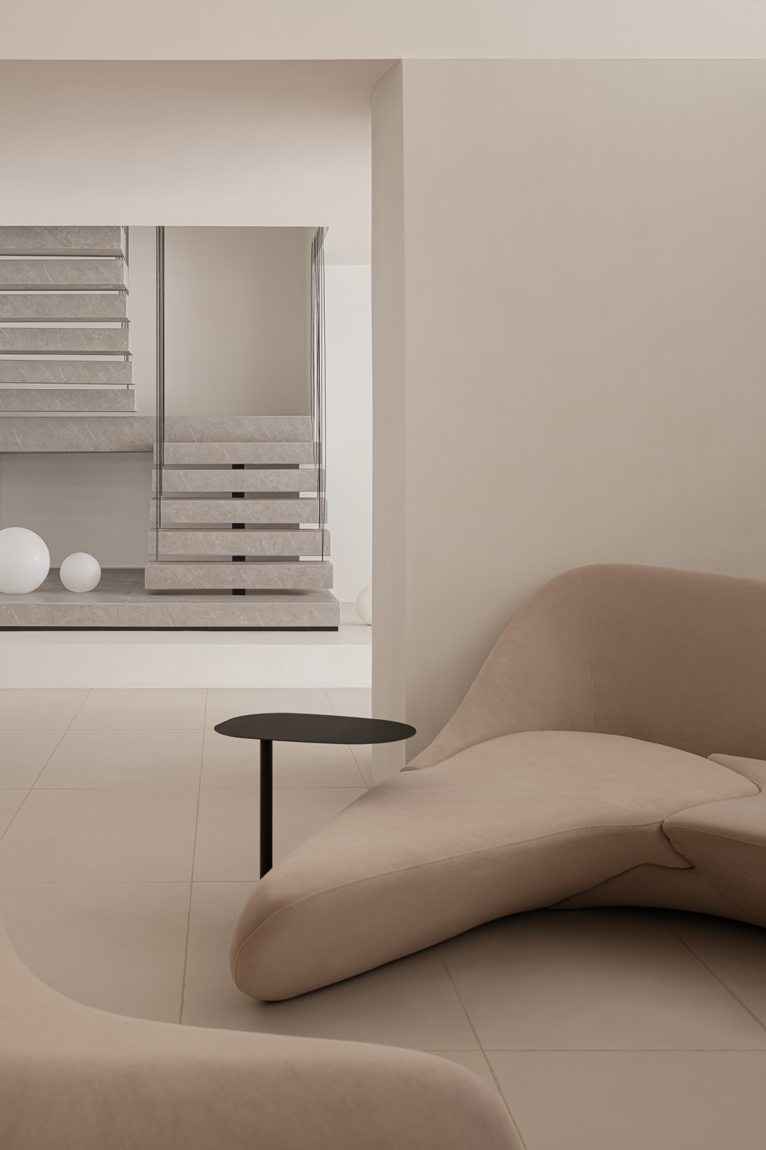 软化边角,弱化围合感与锋锐,以建筑语言构造圆融豁达的处世态度。墙体的弧牵引空间,如同漩涡的边缘。