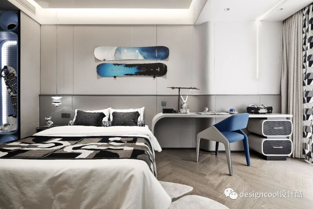 儿童房空间以单板滑雪为主题,空间布局类似在特设的”U"形场地凭借滑坡起跳般回旋。空间设定了场景定格,快速回转滑降,俏皮的潮牌躺椅,在高难度完成之后的欣喜与各种收获满满。空间氛围营造融入了包容,家人的温情,鼓励与激情满溢的青春年少。