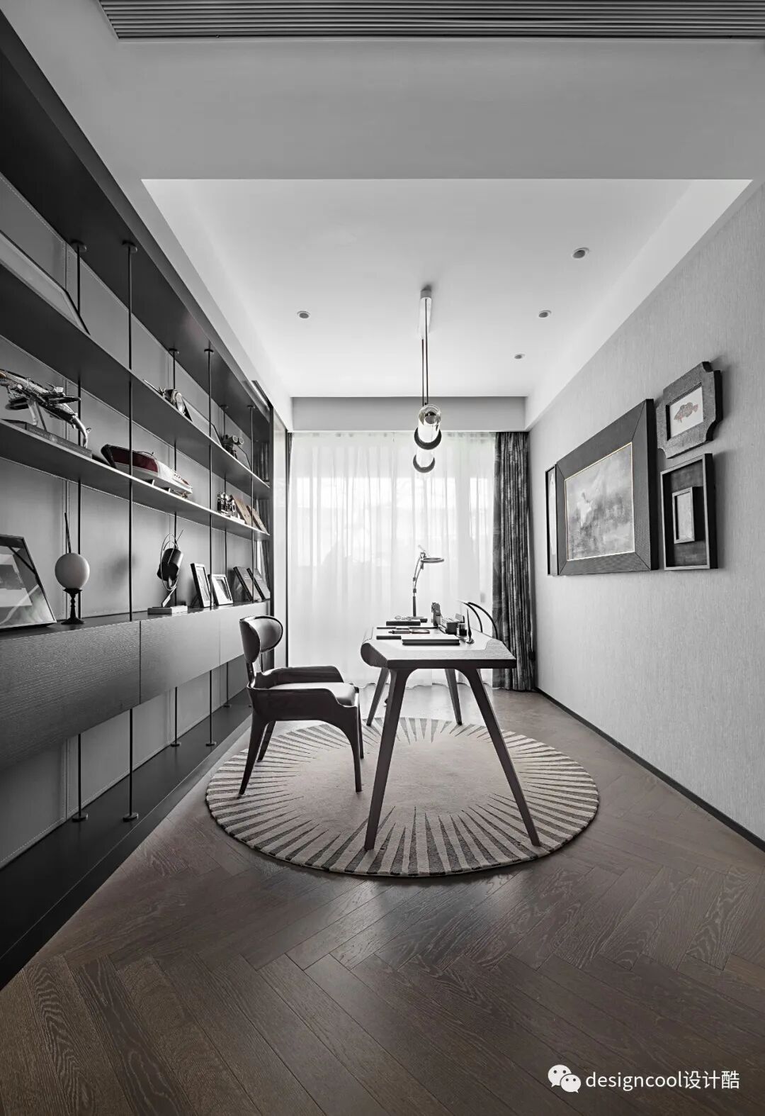 烦恼喧嚣在此处瓦解消散,互动、守静,在有限的空间被兴趣填满,乐趣由此衍生。多元的复合空间功能设计,不仅作为书房使用,同时可以满足主人洽谈与起居的功能,或为男主人安于一隅的私用区域。