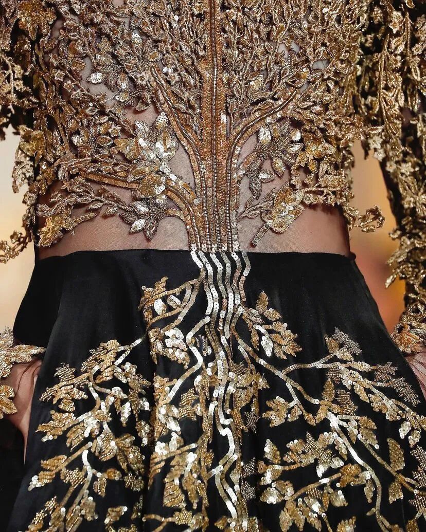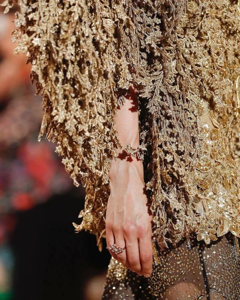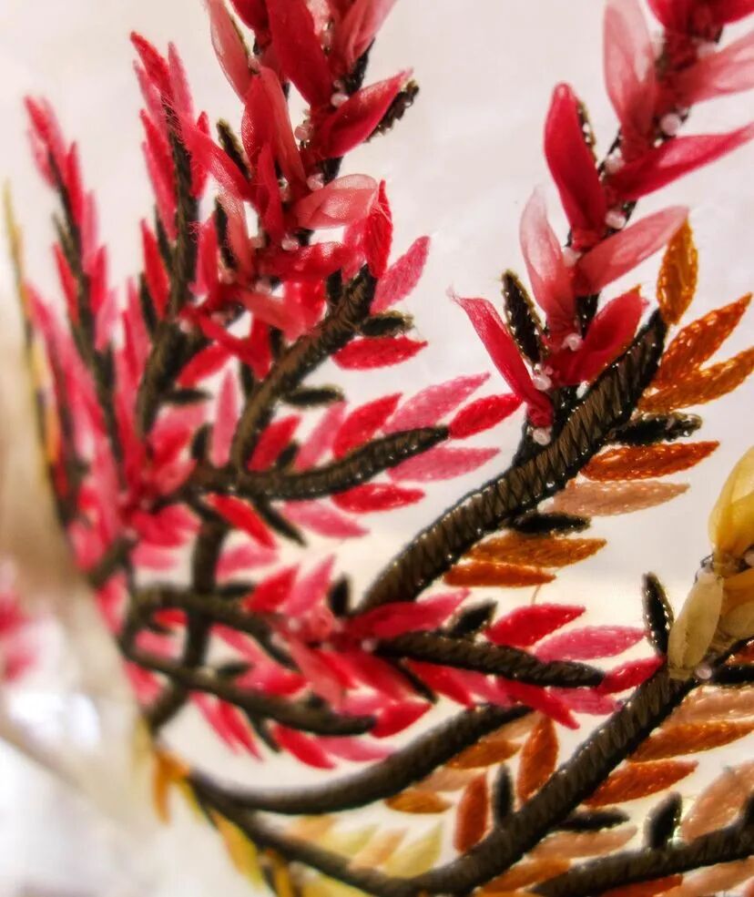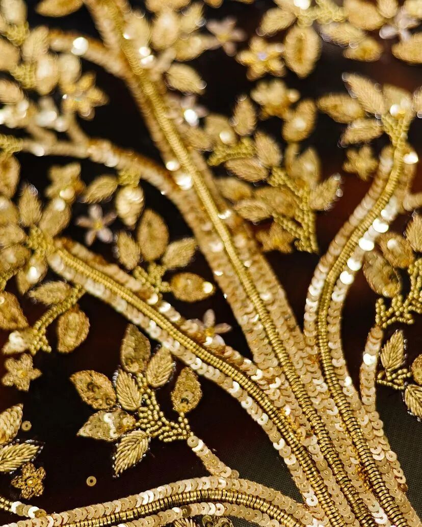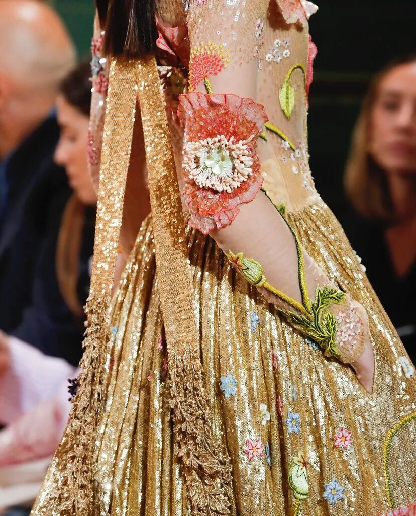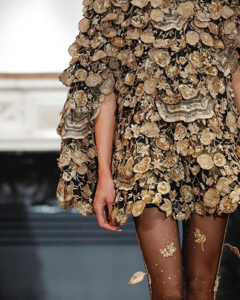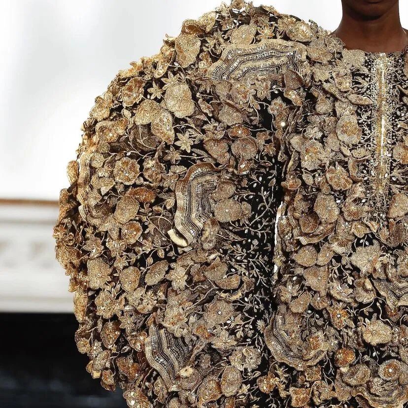 3D手工刺绣,由独立工程的植物和树干图案组成,手工精心打造,金色过度生长令人惊叹,与他们的威严外观相比材料却出人意料的轻。工匠的精湛技巧在其他非凡的主题演绎中得到了充分展示。