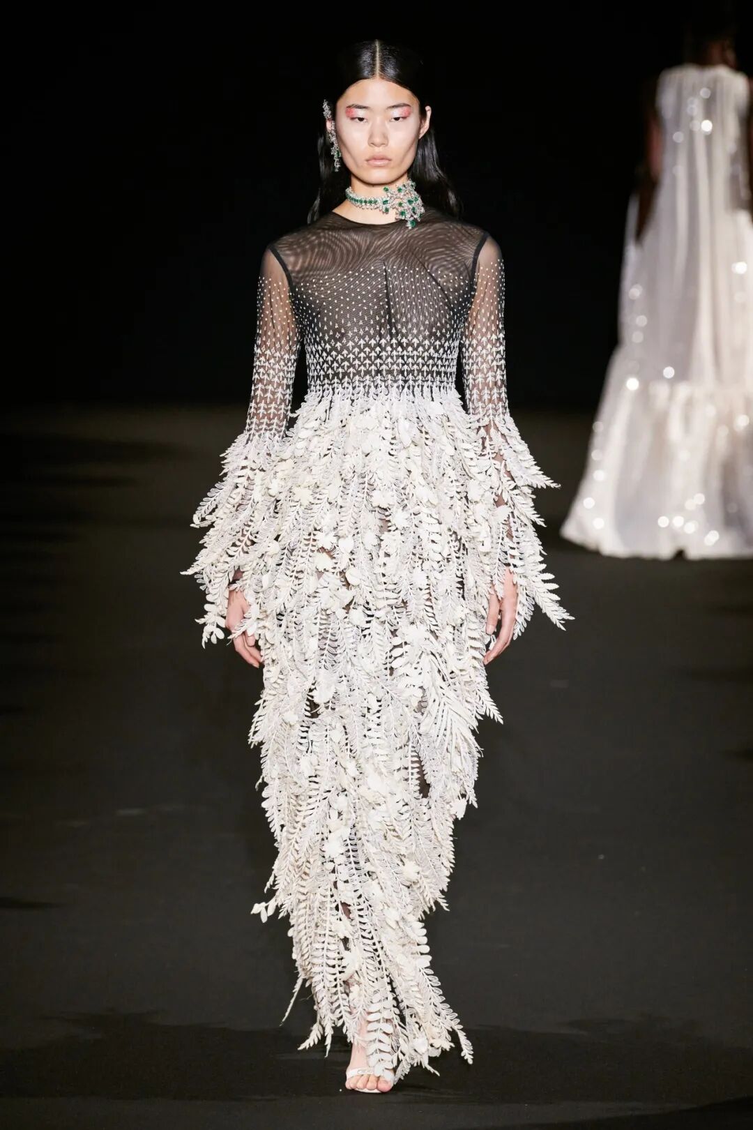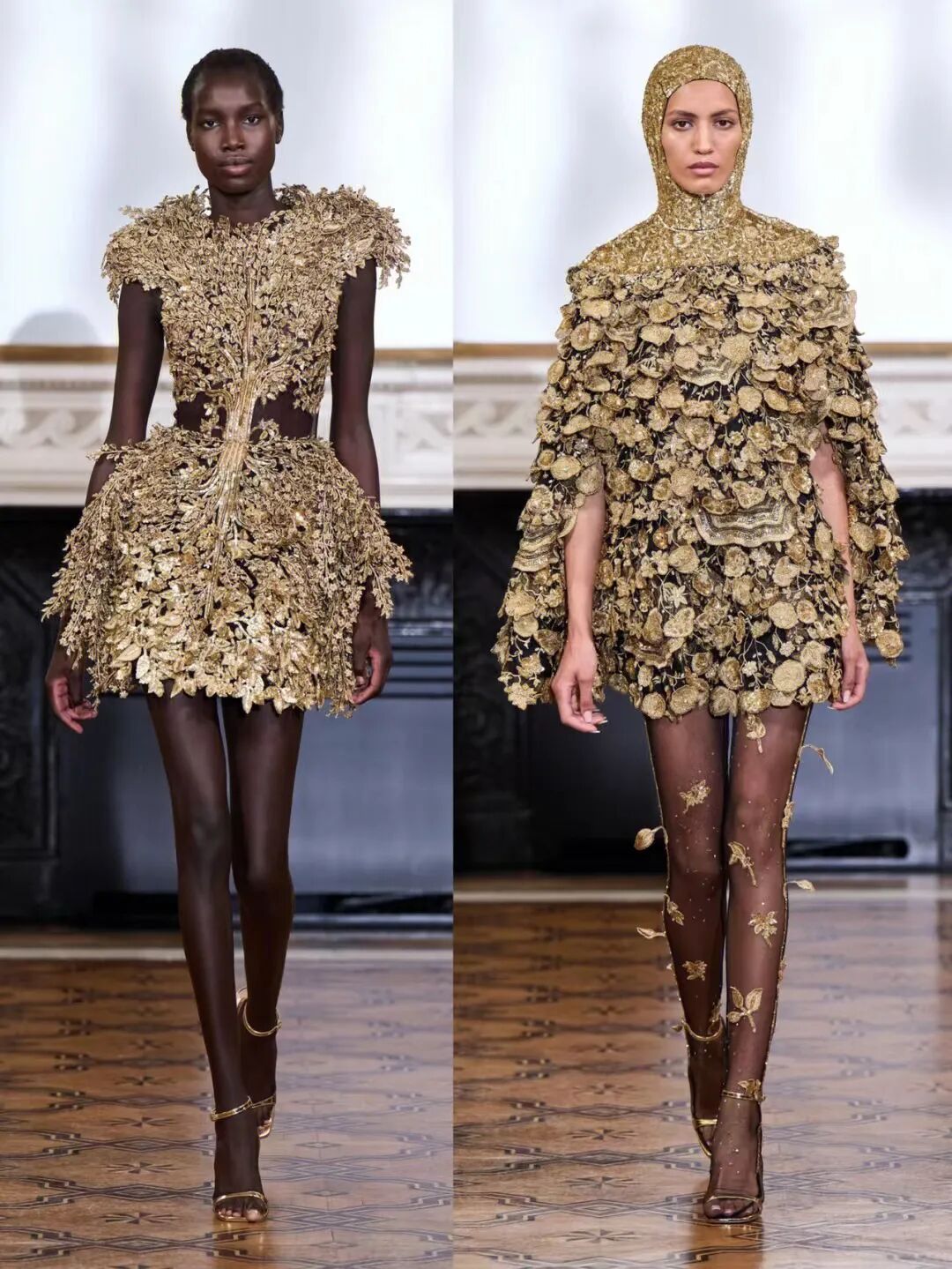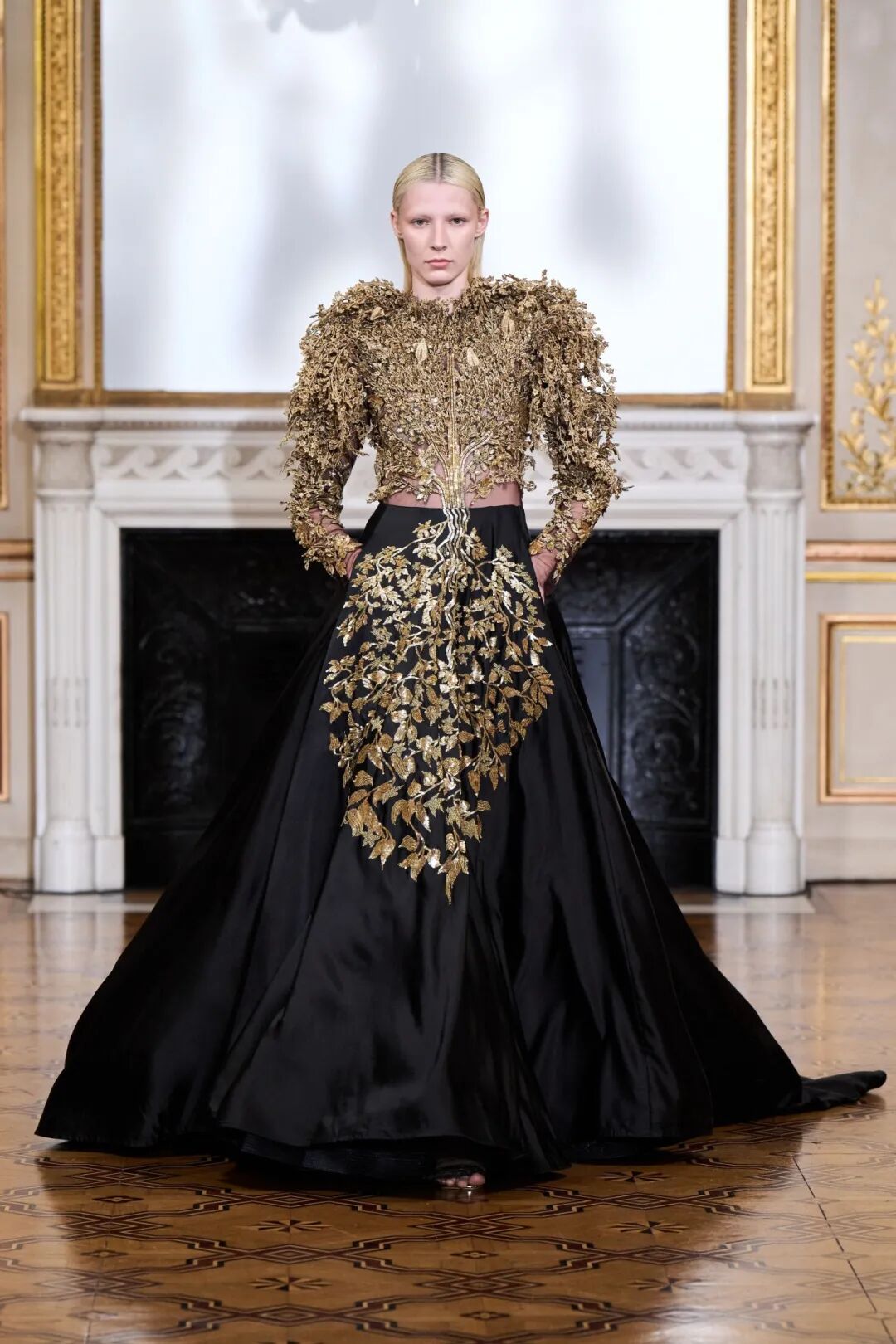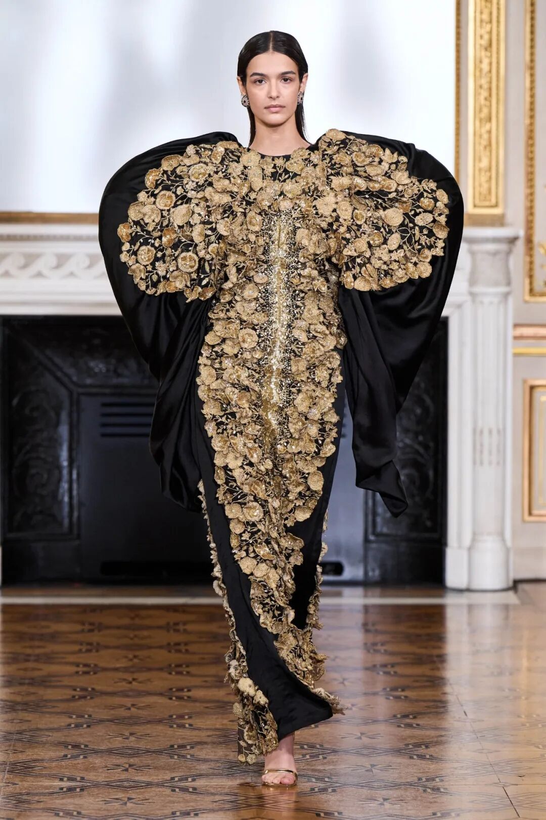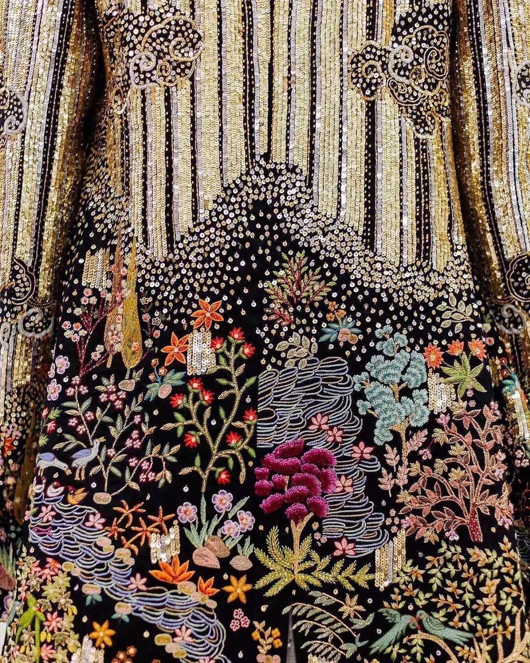 3D手工刺绣,由独立工程的植物和树干图案组成,手工精心打造,金色过度生长令人惊叹,与他们的威严外观相比材料却出人意料的轻。工匠的精湛技巧在其他非凡的主题演绎中得到了充分展示。