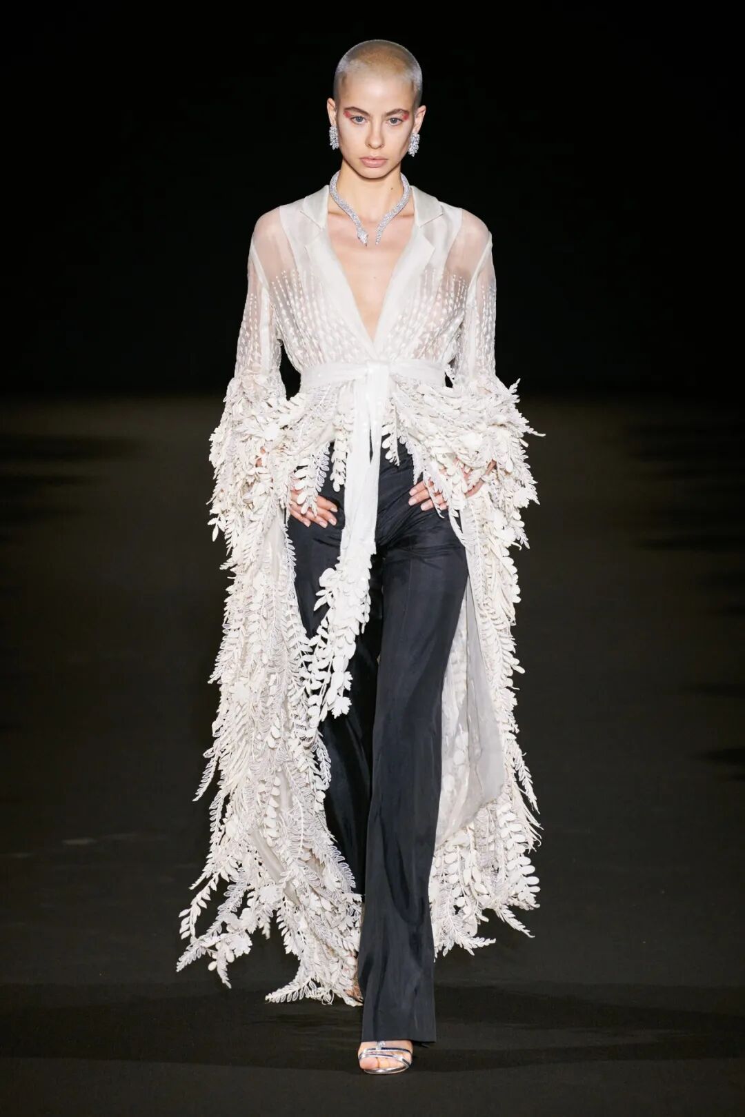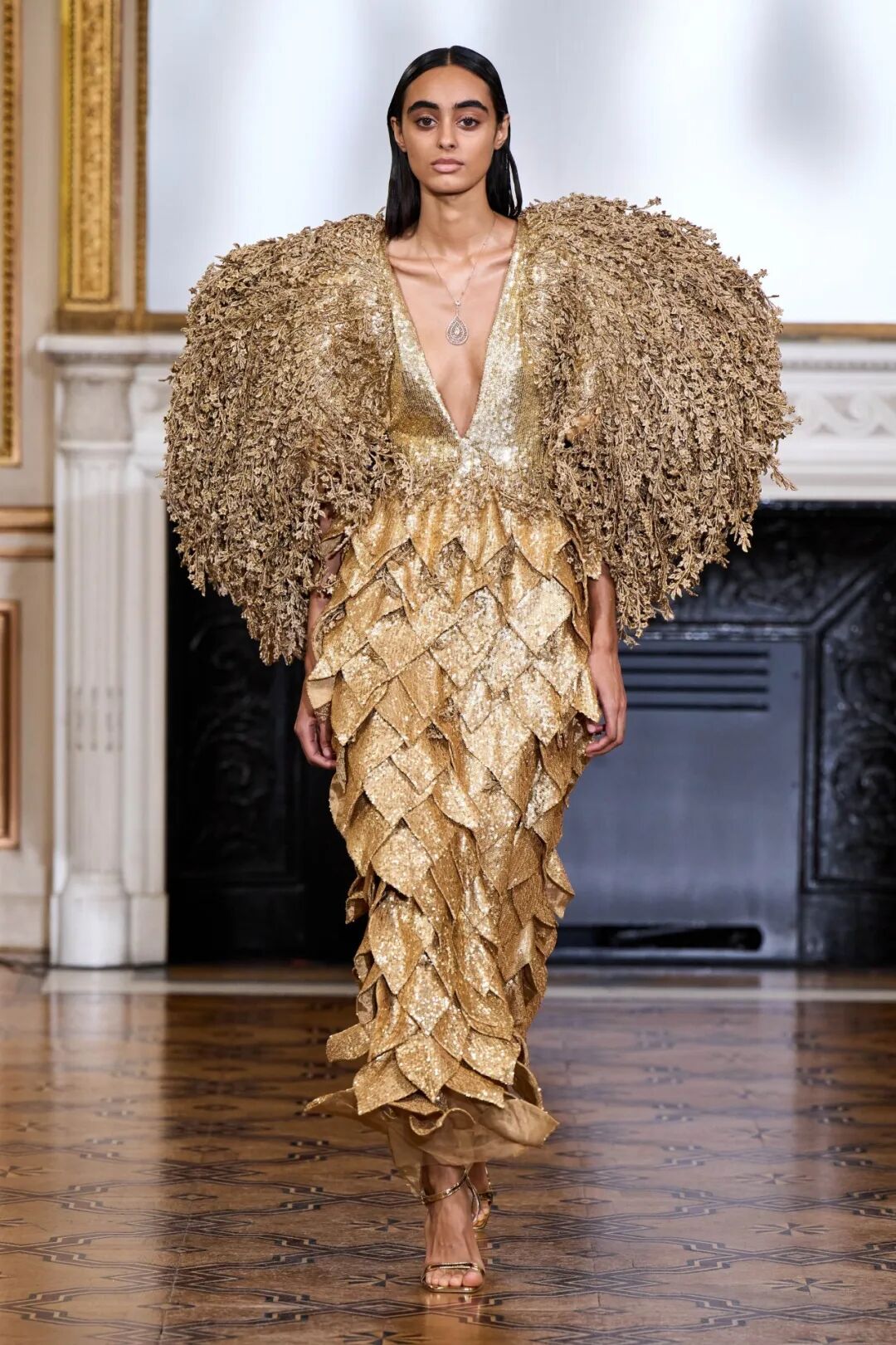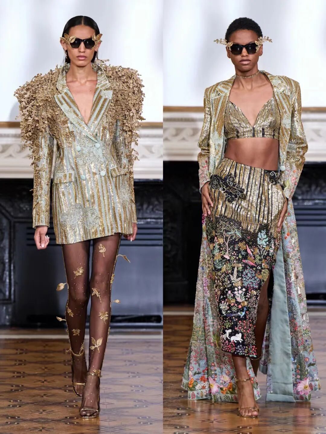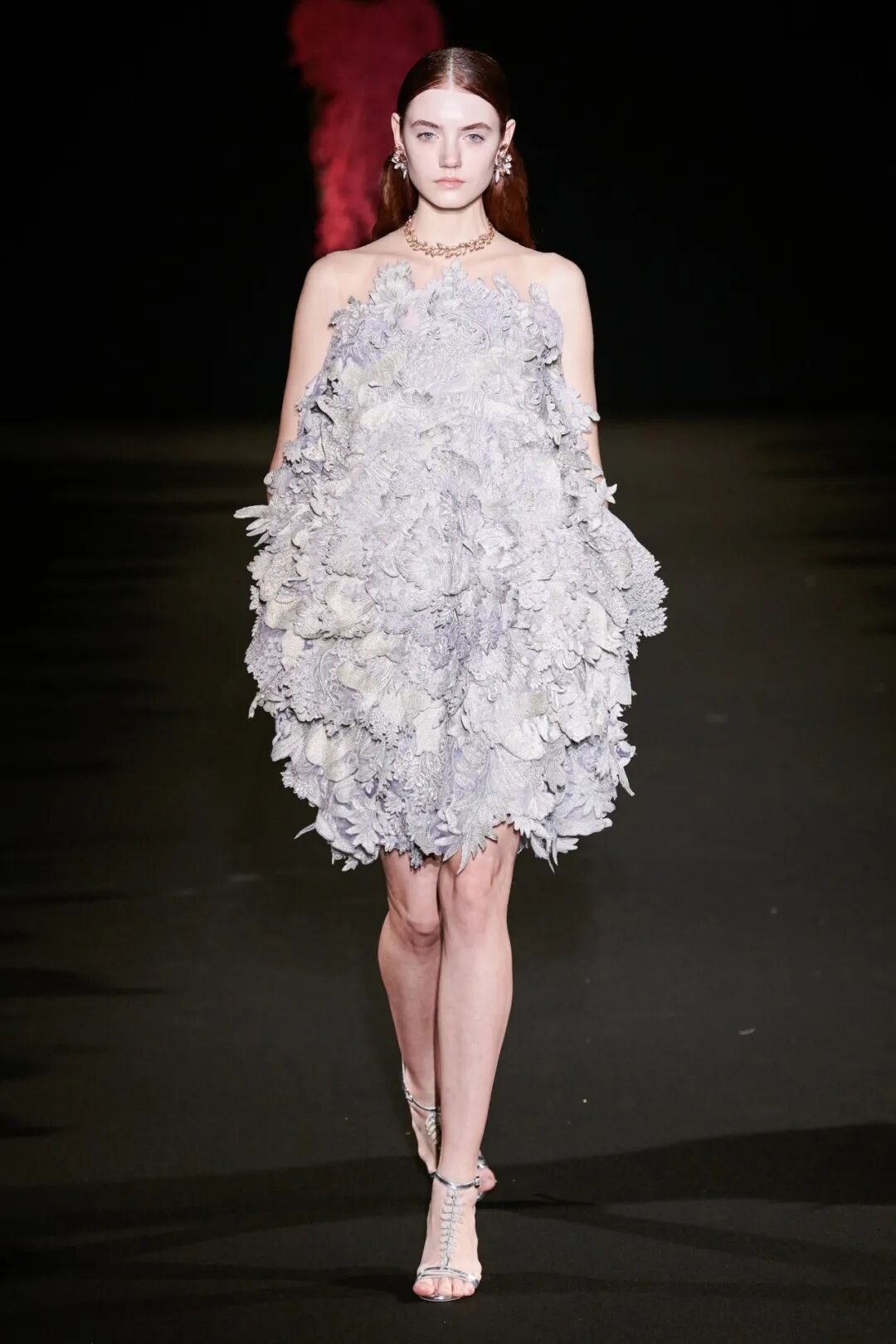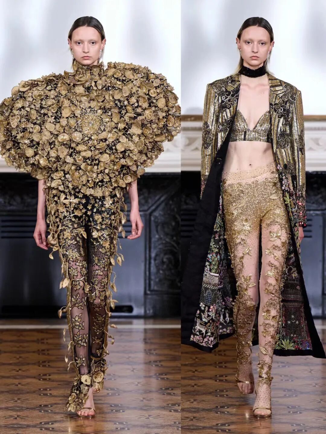 3D手工刺绣,由独立工程的植物和树干图案组成,手工精心打造,金色过度生长令人惊叹,与他们的威严外观相比材料却出人意料的轻。工匠的精湛技巧在其他非凡的主题演绎中得到了充分展示。