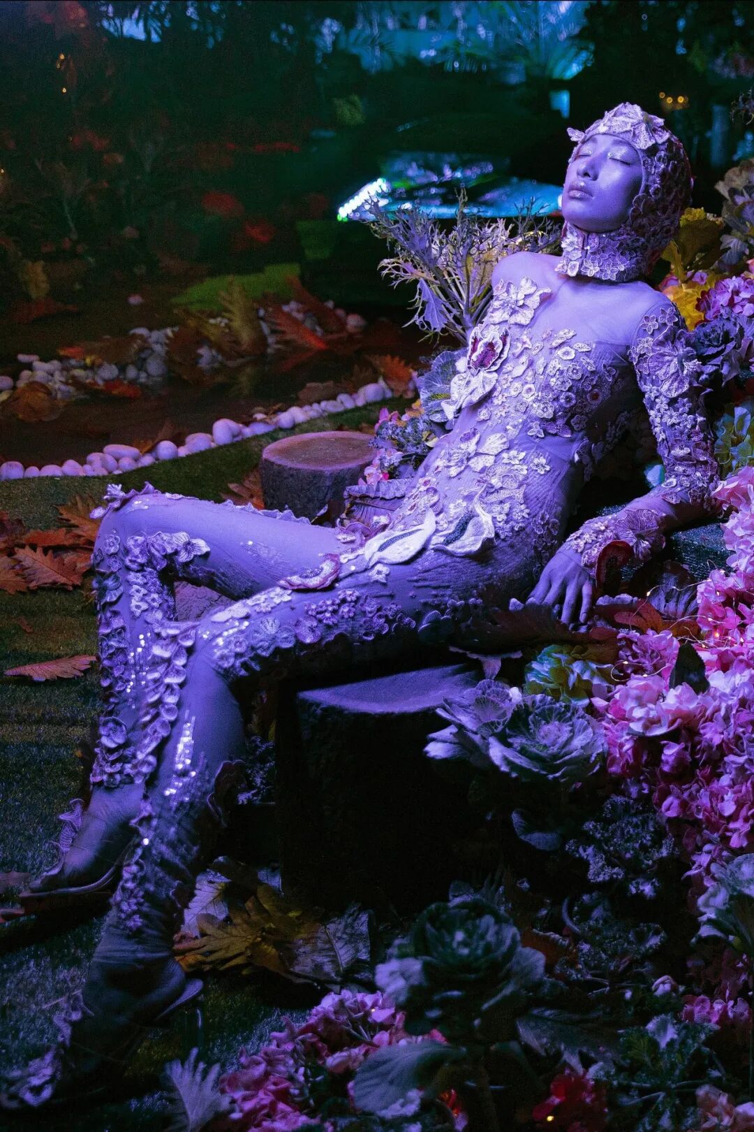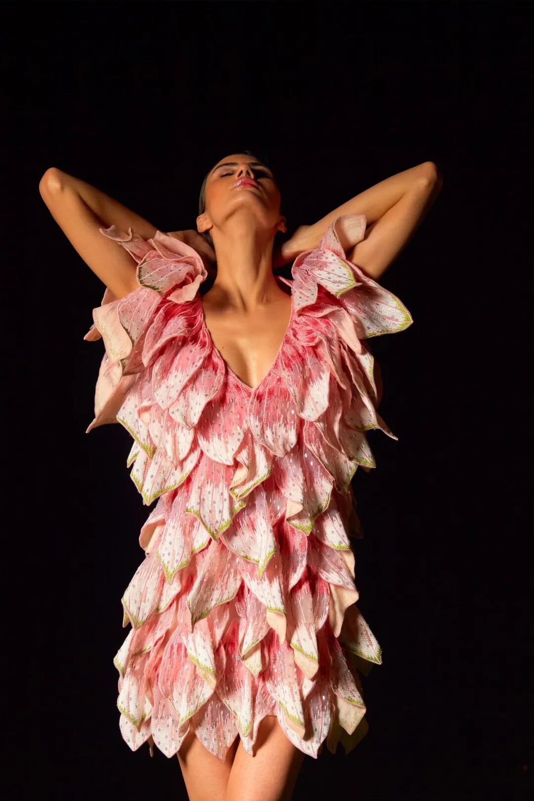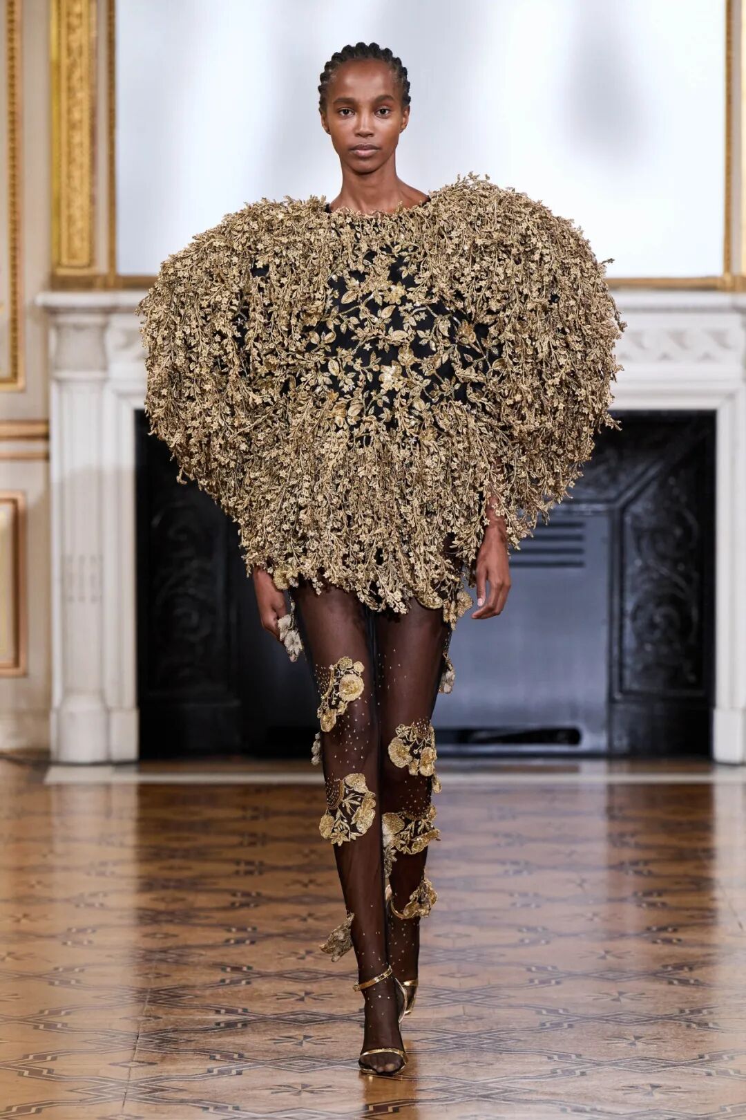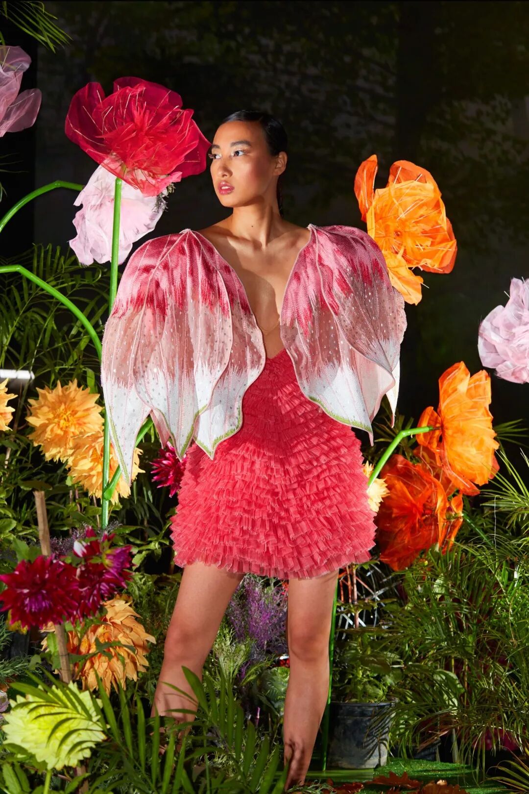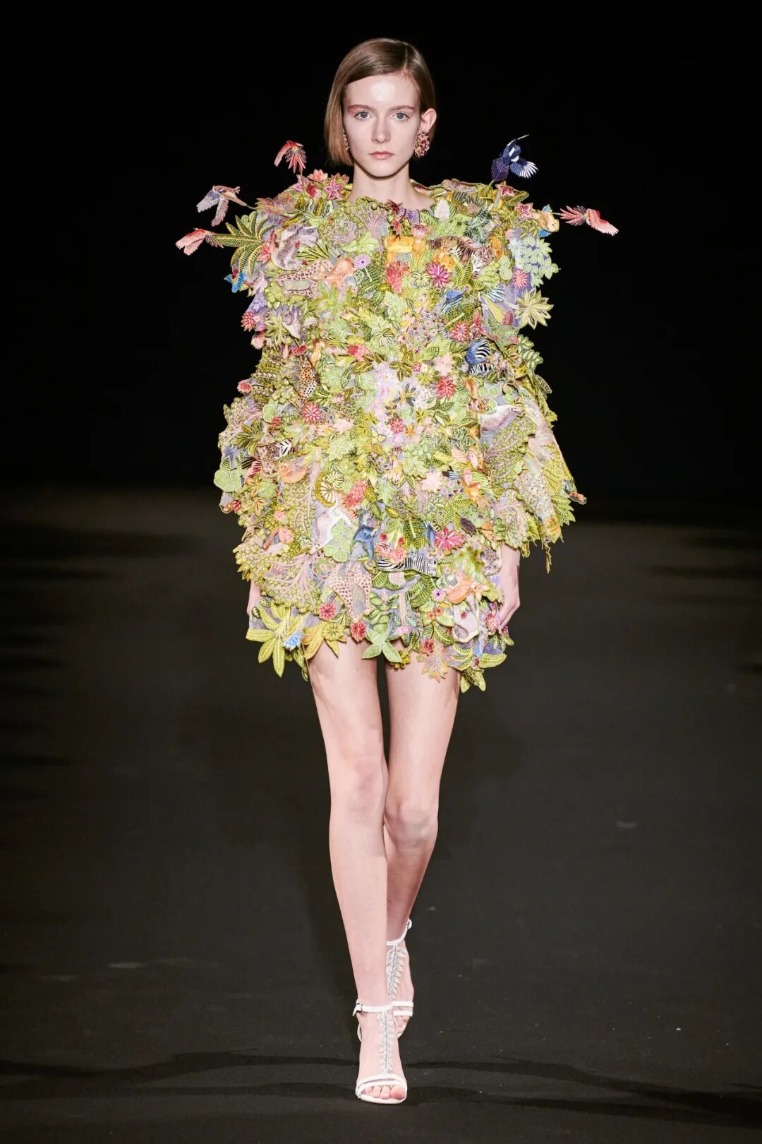 为了使服装的 3D 结构几乎是独立的,工作室研究了毛绒玩具的制作尺寸。这样一来,他们就能够创造出一系列迷你裙和紧身连衣裤,上面长出了巨大的三维拱形袖子,精心绣有数百片颤抖的金线叶子。