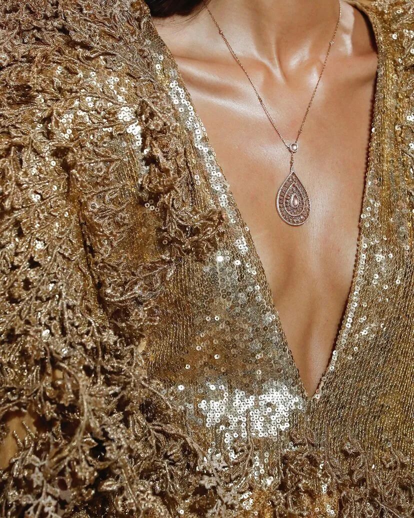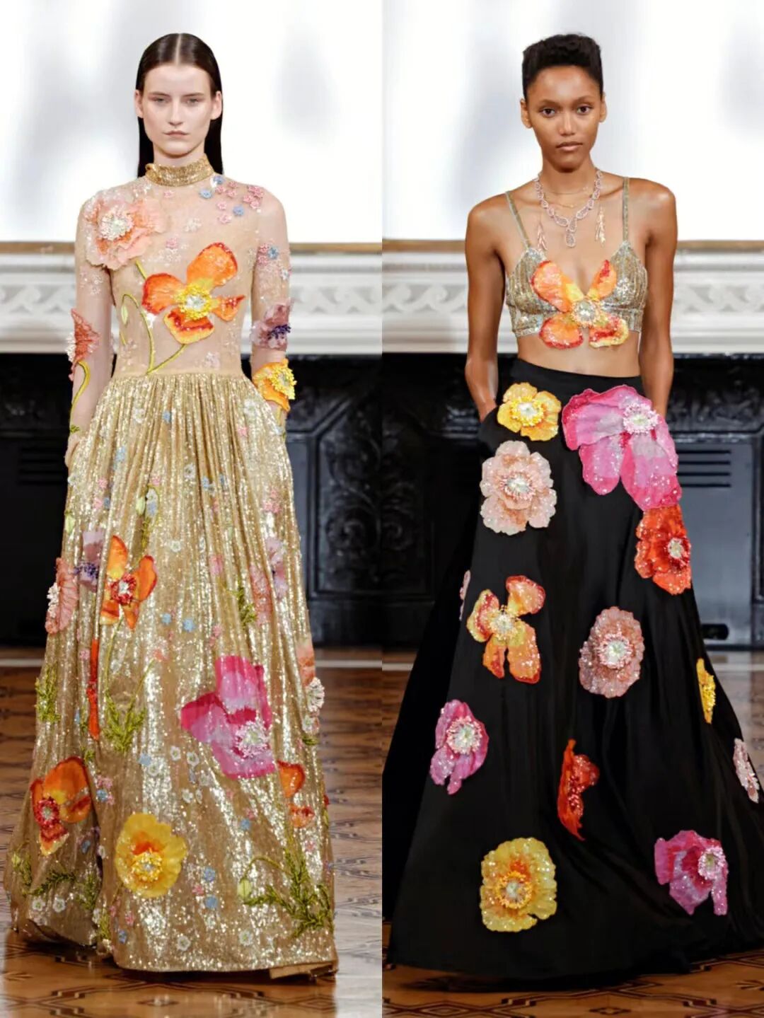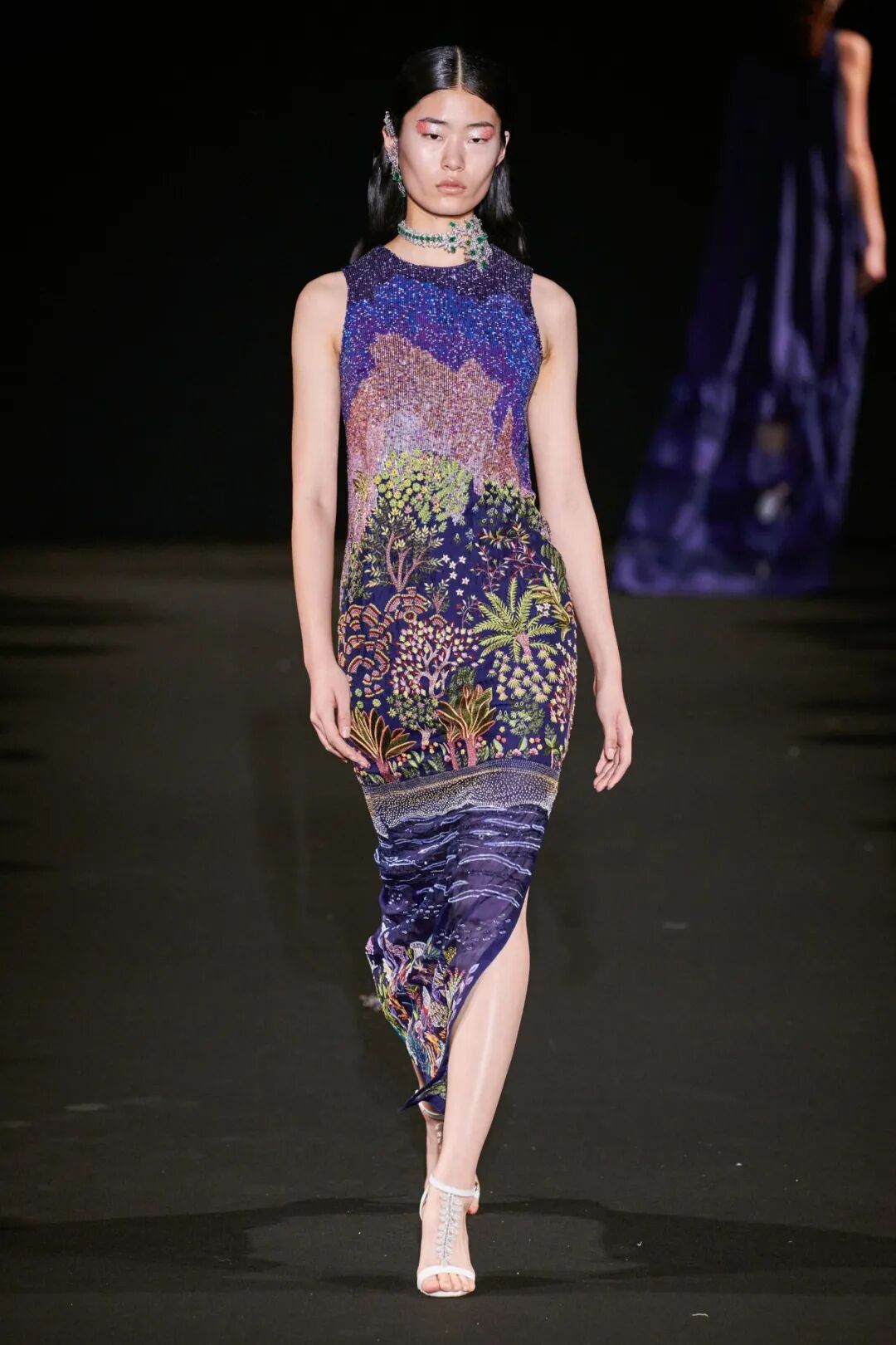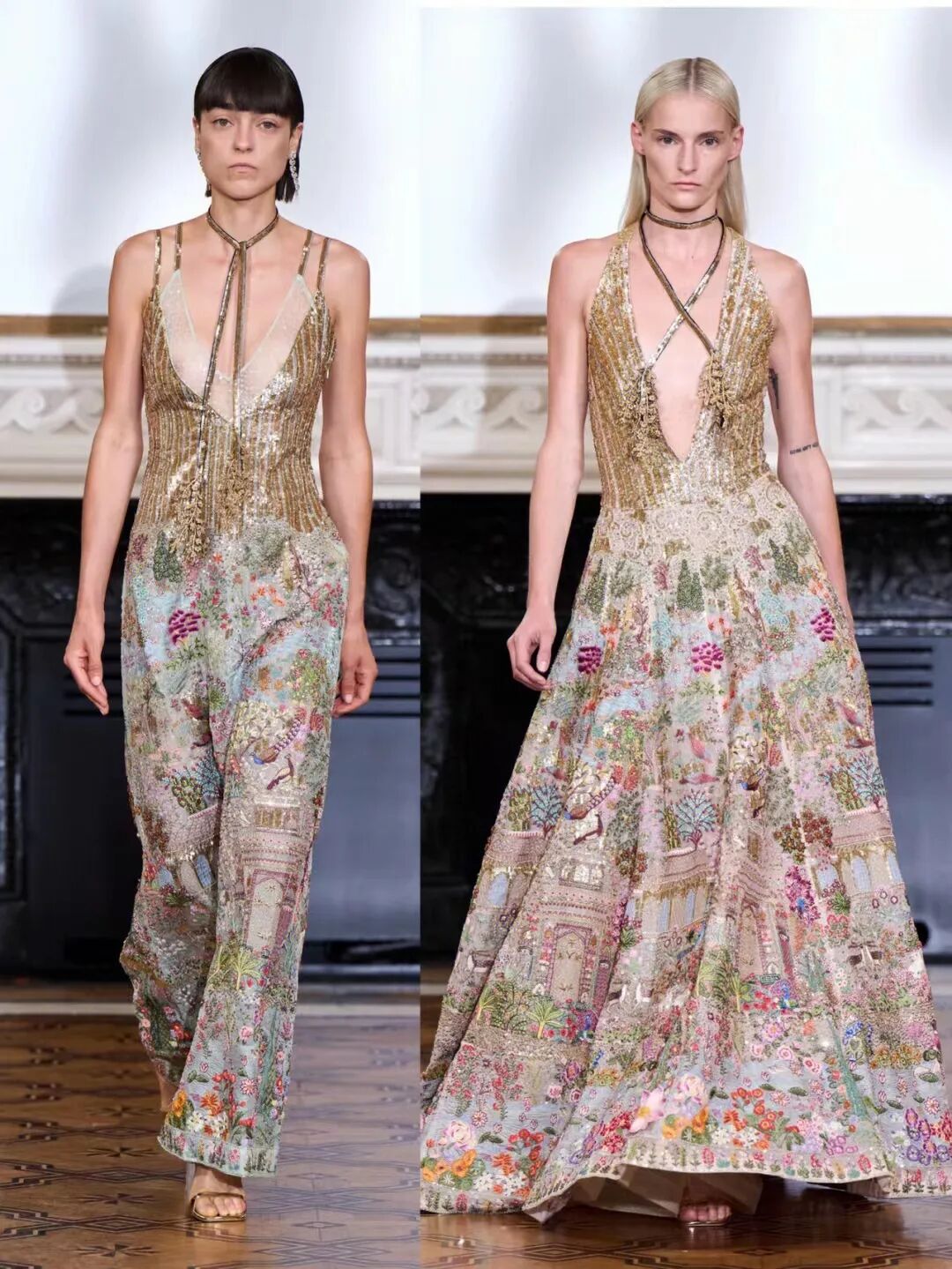 一件舞会礼服和一件带有金色亮片低领紧身胸衣的连身衣,以及一件纤细的抹布,上面完全绣有来自迷人的莫卧儿花园的场景——精灵动物、莲花——如此细致而浓密地渲染,它们似乎随时待命生活。鲜艳的罂粟花同样栩栩如生,开在挂脖吊带吊带上,或开在带有膨胀圆形袖子的垂坠紧身连衣裙上。