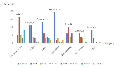 亚洲是古代文明发展的摇篮,截止2019年,亚洲在手工艺和民间艺术分类中一枝独秀。值得注意的是,在37个手工艺和民间艺术城市中,人口超过百万的城市只有9个,占总人口的24%。这类城市中的大多数是小城市,其中8个城市的人口不足10万,相当于中国的一个小城镇。这意味着手工艺和民间艺术可以成为中小城市的区域经济和旅游发展的契机。