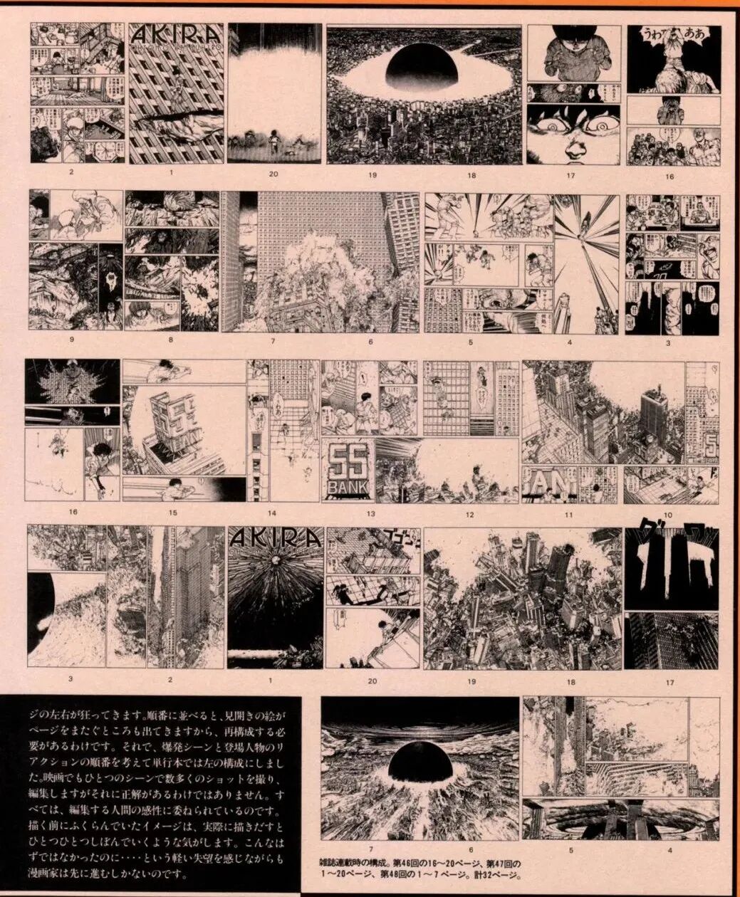 在《阿基拉》漫画中,有一段对于东京爆炸场景的描绘,大友克洋用全无对白的数页,专门描绘东京的天崩地裂。