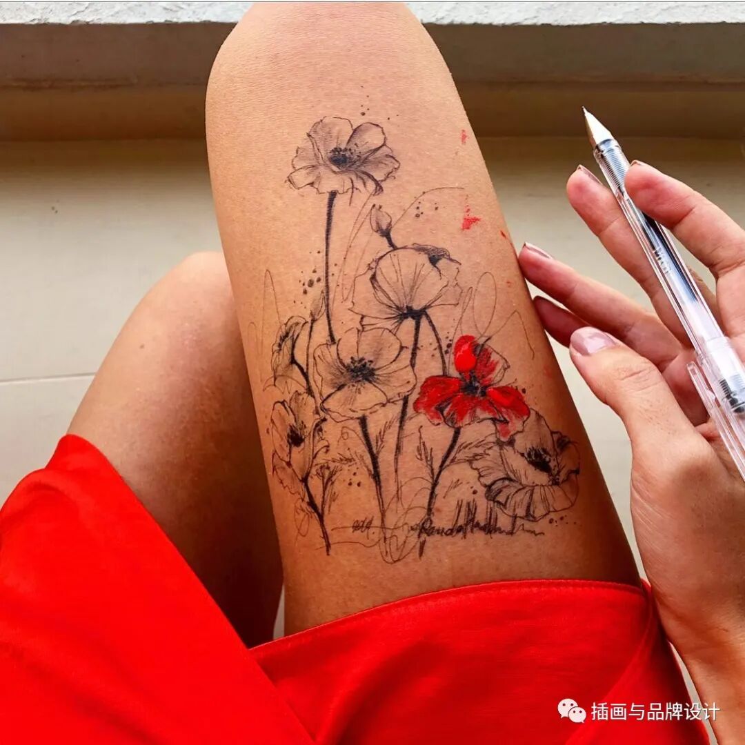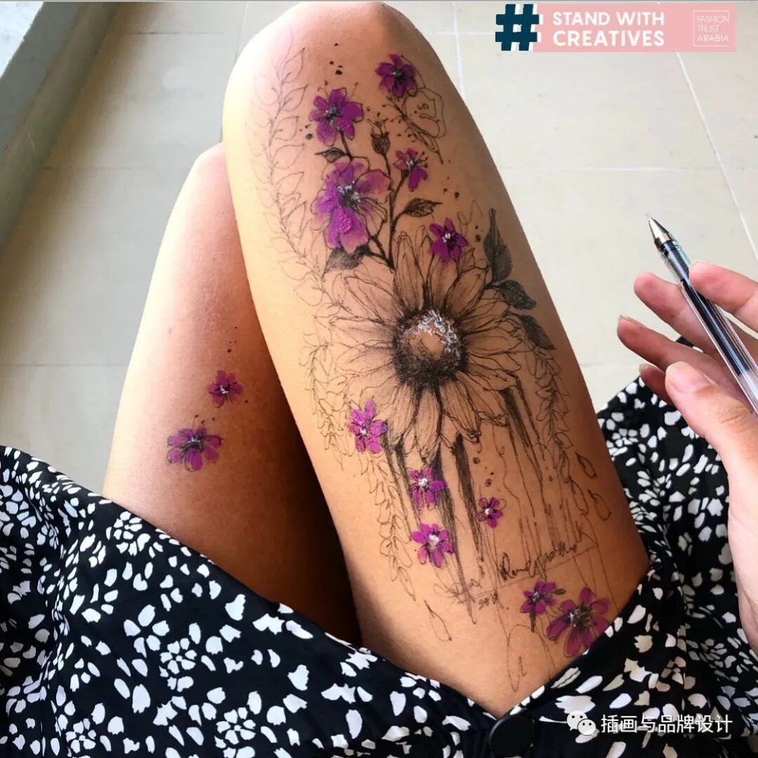 混合颜料和钢笔在大腿上绘制五颜六色的花束