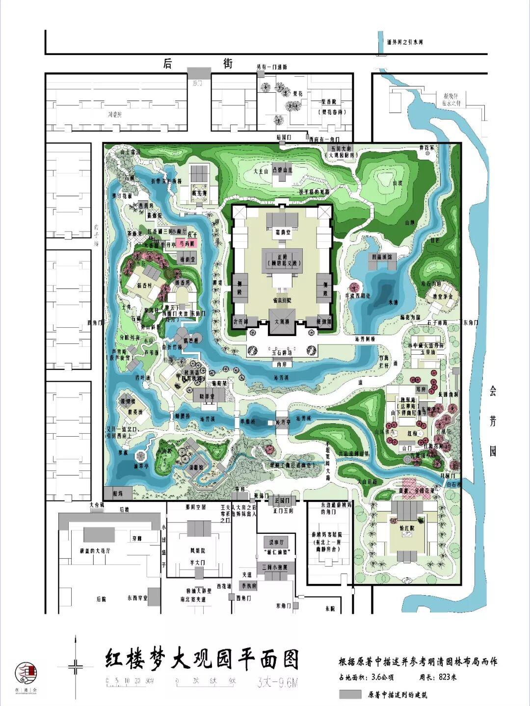 为了贾政长女贾元春的省亲而建造的大观园也是古代贵族园林设计的代表,园林以省亲牌坊和顾恩思义殿为中心,沁芳溪水环绕,四周点缀着众人住处。