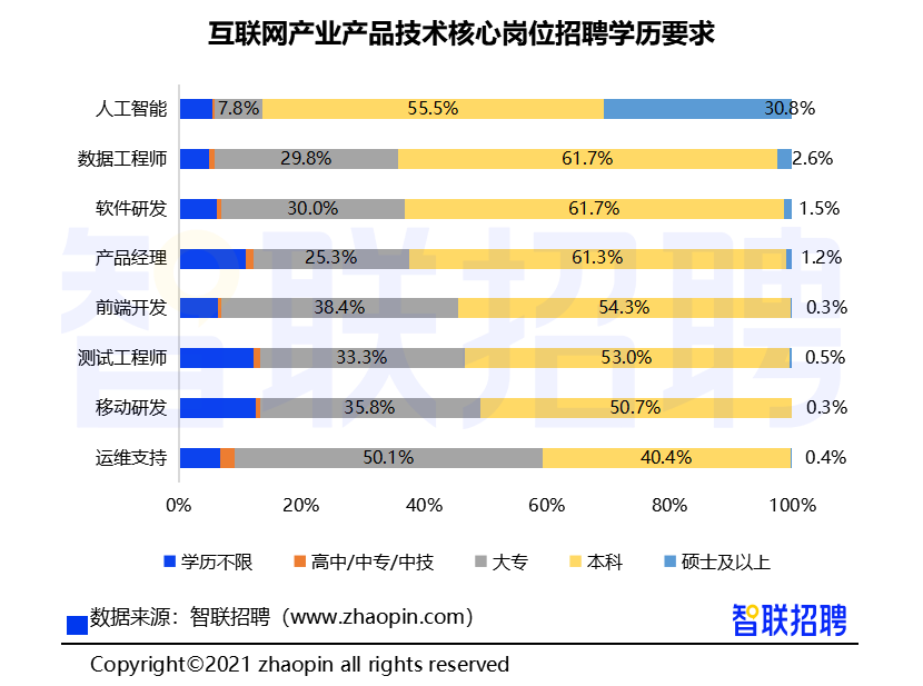 值得一提的是,在人工智能领域中,硕士及以上的岗位需求占比30.8%,远高于其他核心技术岗位。即使大厂的人工智能岗位没有明确的学历要求,相较于本科生,博硕士依然具有碾压性竞争力。