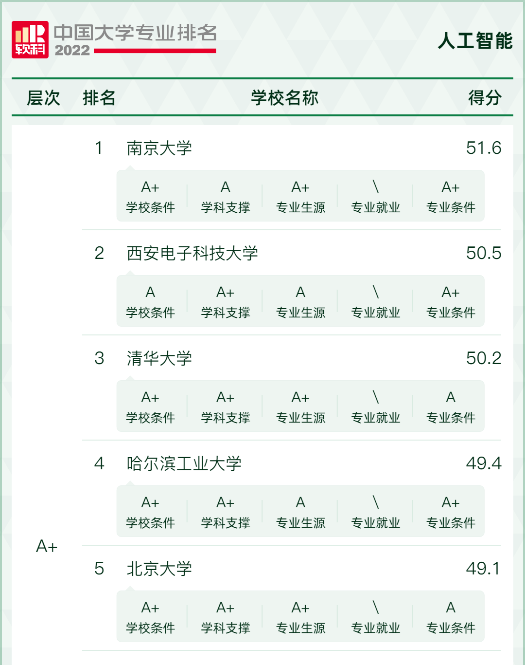 在2022“软科中国大学专业排名”中,我们可以看到,在人工智能专业里,南京大学为榜首,传统工科强校占据绝对优势。