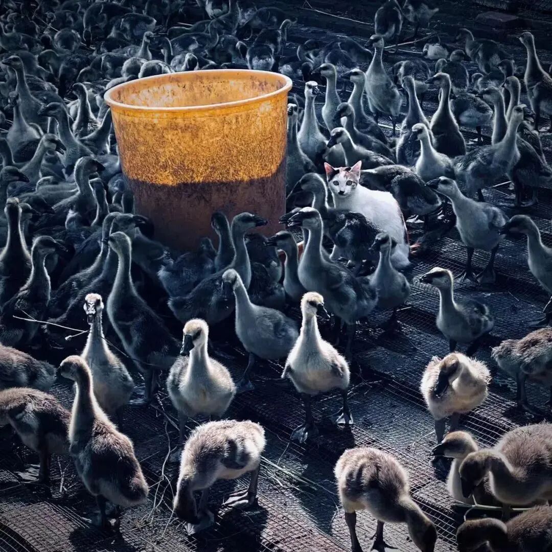 拍摄说明:一只花白色小猫闯入小鹅群当中,让画面显得格外有趣。